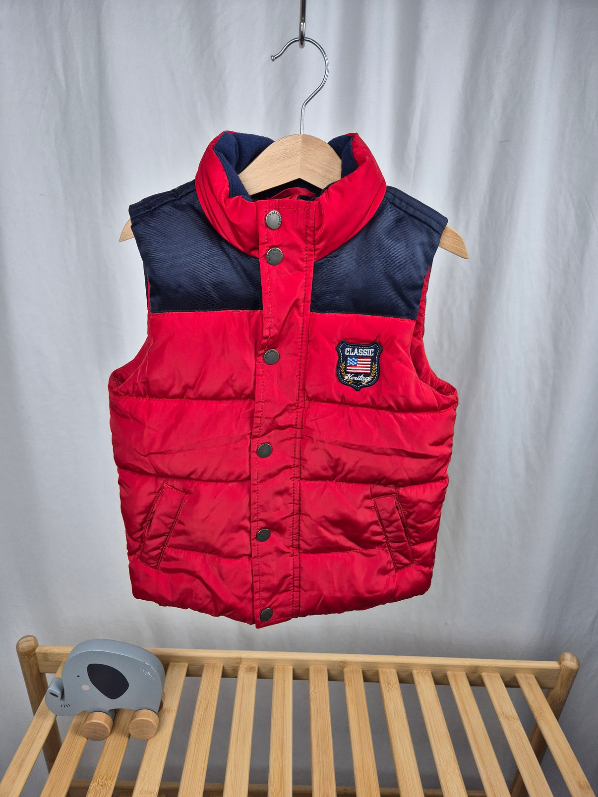 Stylová chlapecká prošívaná vesta Lindex ve velikosti 110 v kombinaci sytě červené a tmavě modré barvy. Vesta má vysoký stojáček, praktické kapsy na bocích a zapínání na patentní druky. Na přední straně je malý nášivkový detail „Classic Heritage“, který doplňuje sportovní vzhled. Zadní část zdobí reflexní prvek se třemi hvězdami, díky kterému je vesta bezpečnější při nošení venku.
