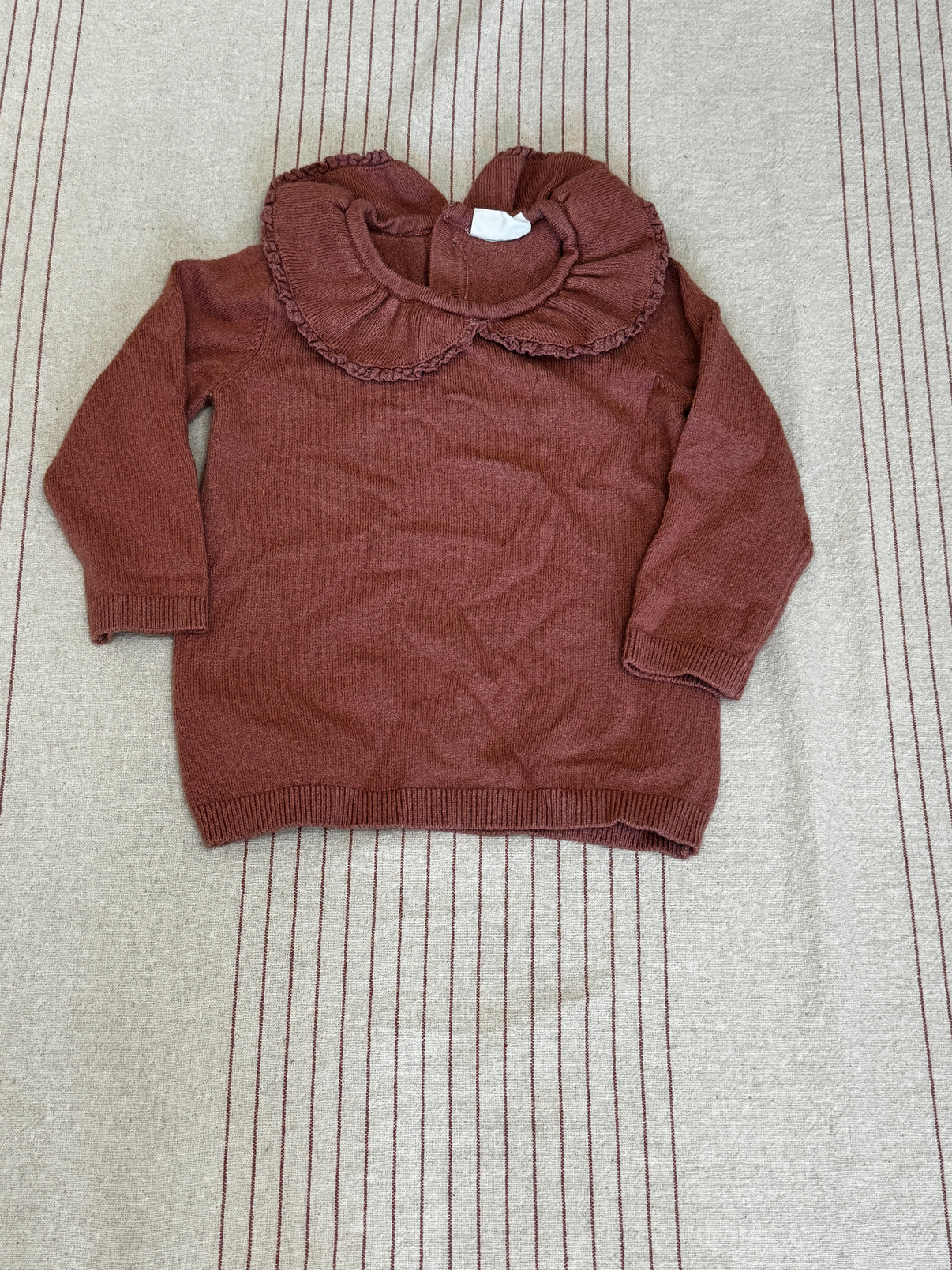 Roztomilý dětský svetr v teplé cihlové barvě s jemným nádechem rezavé. Svetr má stylový, široký volánový límeček, který přidává elegantní šmrnc, vhodný jak na běžné nošení, tak i na speciální příležitosti. Dlouhé rukávy a příjemný materiál zajistí pohodlí pro malé slečny, ideální na chladnější dny. Na zadní části praktické zapínání na knoflíčky. Svetr je od značky F&F, což zaručuje kvalitu a moderní design. Skvěle se hodí do školky, na procházky nebo třeba na návštěvy k rodině. Pro holčičky okolo velikosti 74 cm.