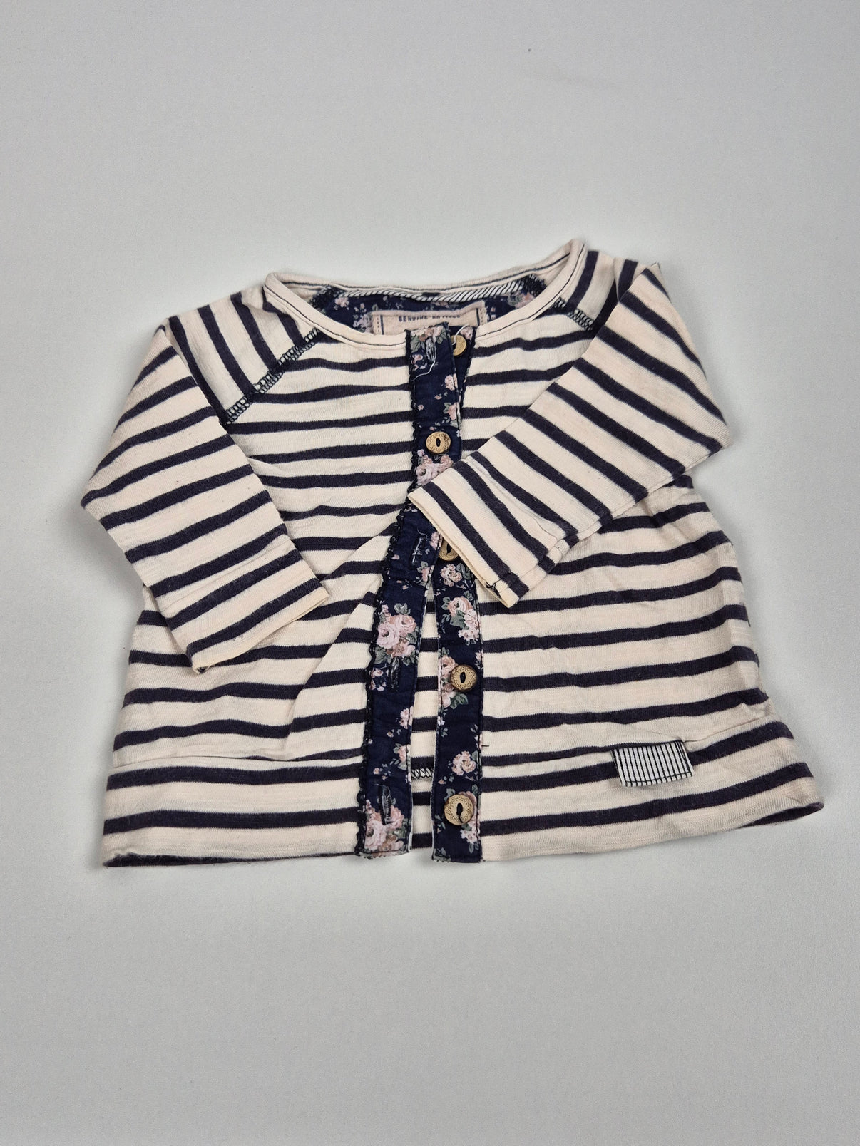 Pruhované tričko Next ve velikosti 62/68 kombinuje tmavě modré a krémové proužky a zapínání na knoflíky s květinovým vzorem, které dodává kousku jemný detail. Tričko je z příjemné bavlny, ideální...