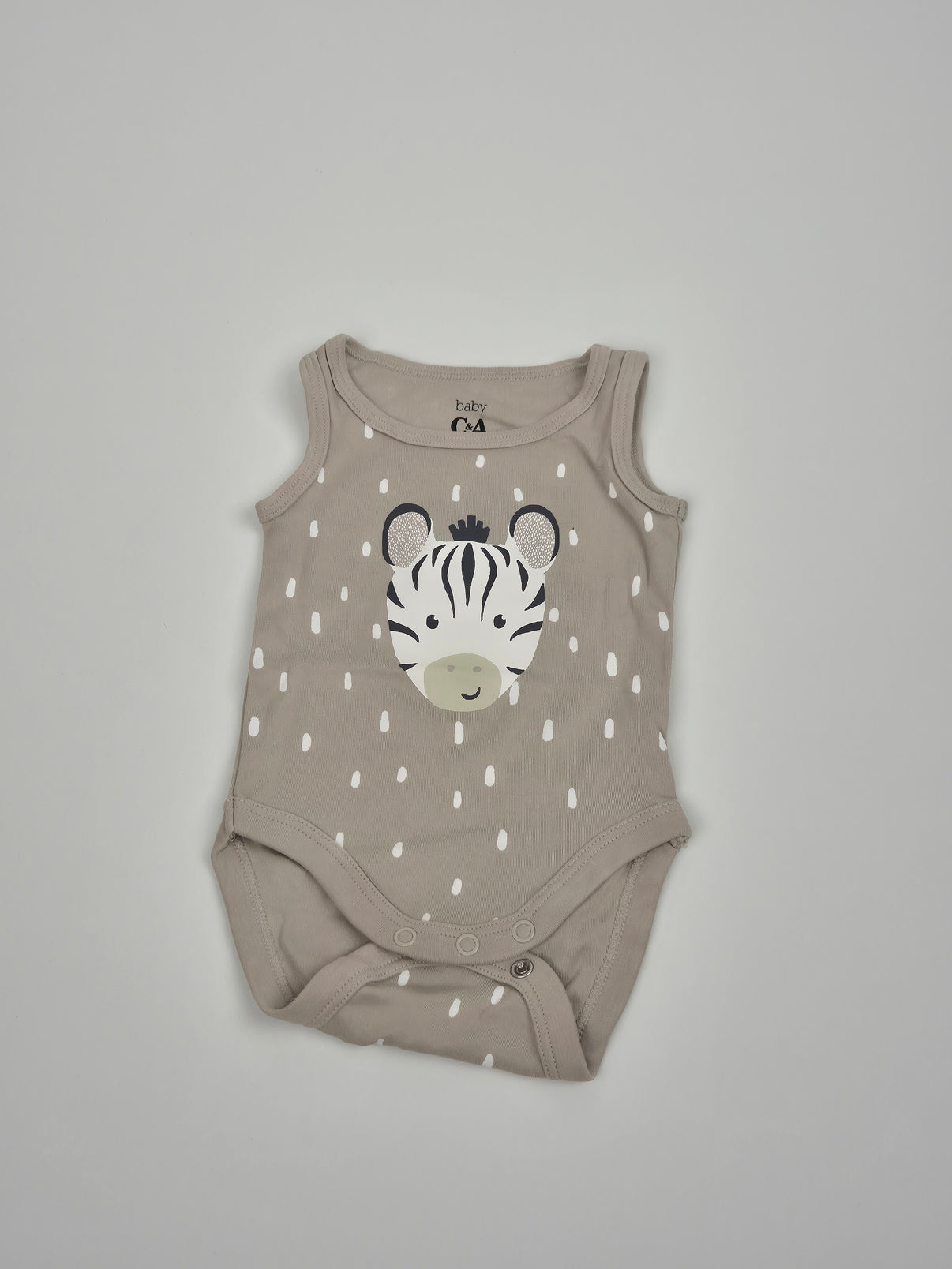 Letní body bez rukávů od značky C&A ve velikosti 62 je skvělým parťákem do teplých dní. Tónované do jemného taupe odstínu s bílými puntíky a roztomilým motivem zebry, zaujme na první pohled. Díky příjemnému bavlněnému materiálu a praktickému zapínání mezi nožičkami se snadno obléká i nosí. Univerzální kousek vhodný pro holčičku i chlapečka.