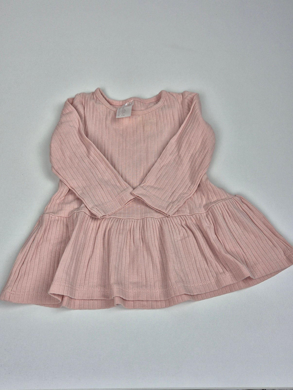 Jemné růžové šatičky značky H&M ve velikosti 68. Žebrovaný úplet dodává kousku elegantní vzhled, volánková sukýnka působí roztomile a dlouhý rukáv se hodí i do chladnějších dní. Univerzální kousek pro malou parádnici – na běžné nošení i slavnostnější příležitosti. 🌸👗