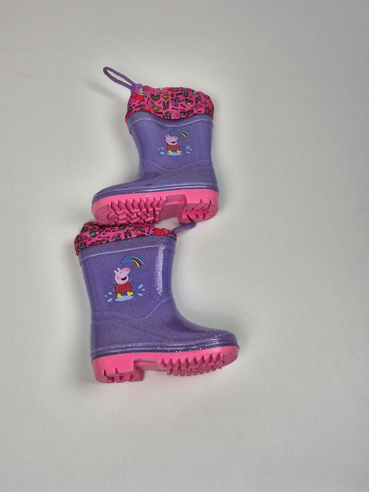 Veselé holínky v kombinaci fialové a růžové barvy s oblíbeným motivem prasátka Peppy. Lesklý materiál s jemným třpytivým efektem zaujme na první pohled a hravý vzor potěší každou malou fanynku pohádek. Protiskluzová podrážka v růžovém odstínu zajistí stabilitu při skákání v kalužích i běhání venku. Praktické poutko usnadňuje obouvání. Ideální volba do deště, na zahradu i na procházky v mokrém počasí. Vhodné především pro holčičku.
