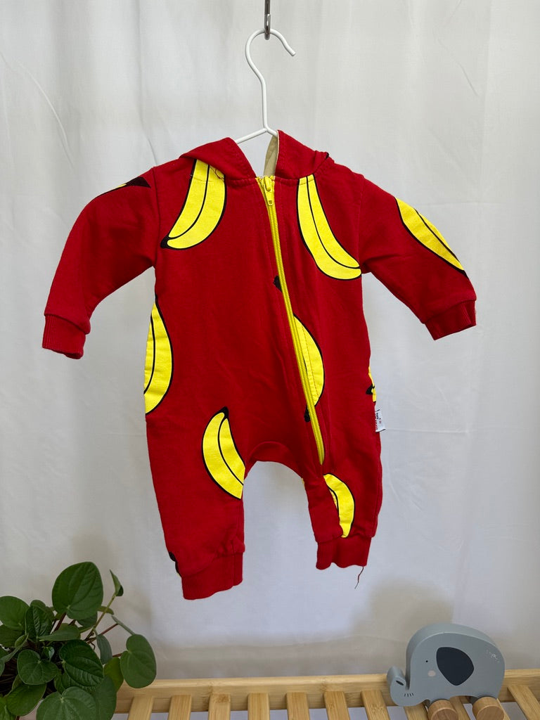 Veselý červený overal s motivem banánů značky Murat ve velikosti 62 je ideálním kouskem pro malé milovníky pohodlí. Overal má praktický zip po celé délce, což usnadňuje oblékání a přebalování....