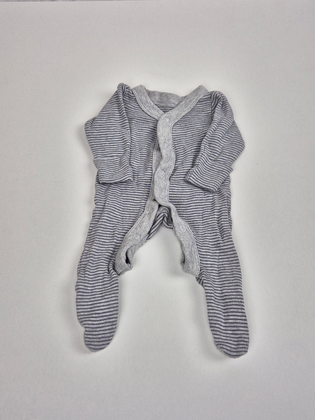 Měkké a pohodlné dupačky v jemném šedém melíru s decentním proužkem – ideální pro novorozené miminko. Celopropínací zapínání na patentky usnadňuje oblékání i přebalování, a díky uzavřeným nožičkám zůstává miminko hezky v teple. Příjemný bavlněný materiál je vhodný pro každodenní nošení i jako domácí overal pro první týdny.