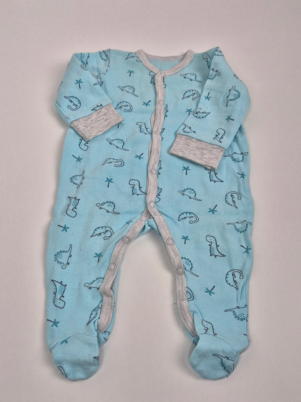 Roztomilé světle modré dupačky ve velikosti 62 s celoplošným potiskem malých dinosaurů. Měkký a příjemný materiál je ideální pro miminko na spaní i celodenní pohodlí. Praktické zapínání na druky po celé délce usnadňuje oblékání i přebalování. Šedé lemy dodávají jemný kontrastní detail.