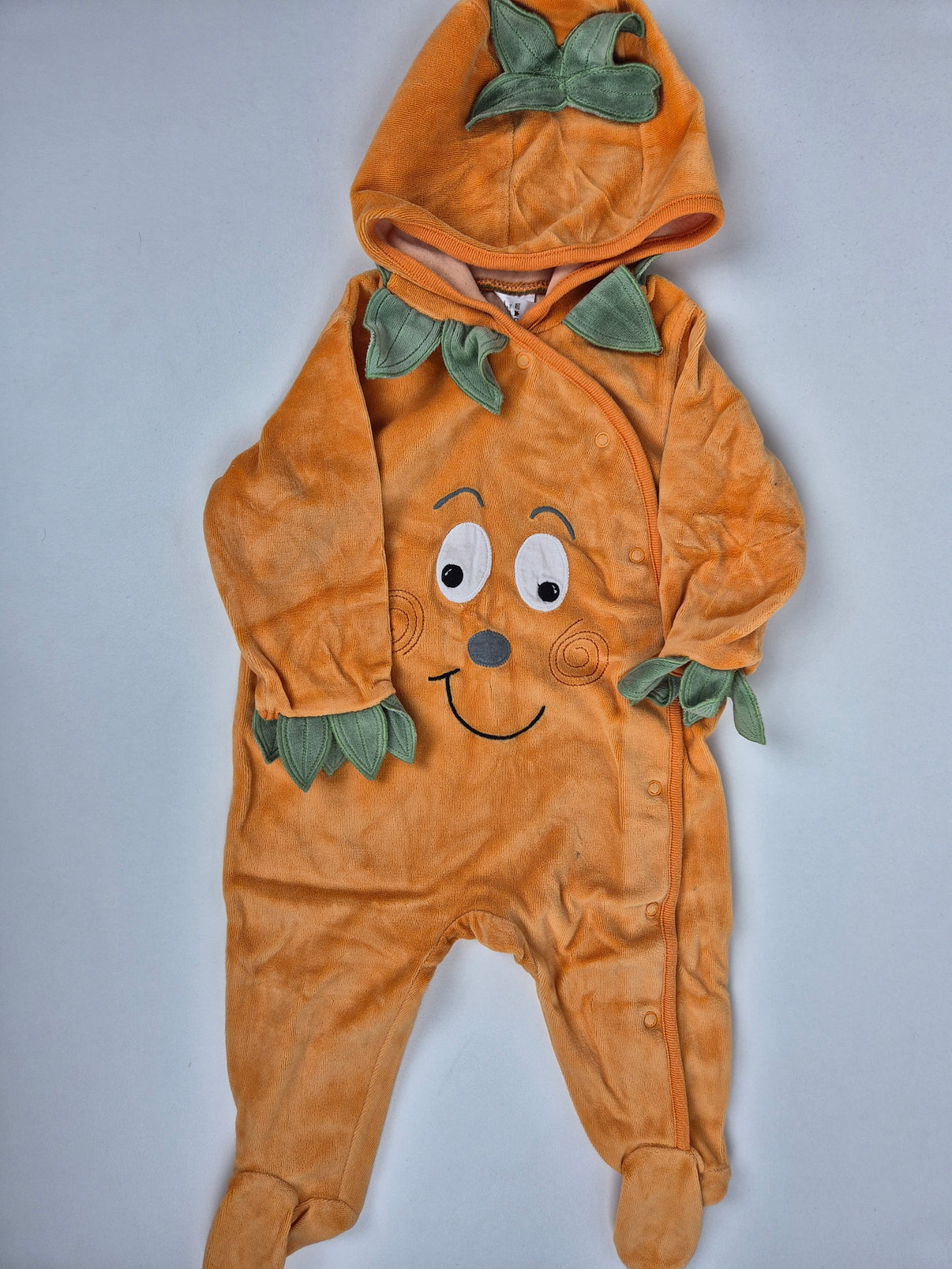 Roztomilé dětské dupačky F&F ve veselém dýňovém provedení. Jemný sametový materiál v oranžové barvě zdobí úsměvavý obličej a zelené lístky, které dodávají outfitu hravý a originální vzhled. Díky zapínání na patentky se snadno oblékají i svlékají. Skvělá volba na podzimní období, na karneval, Halloween nebo jen tak na doma. Kousek je vhodný pro holčičky i chlapečky.