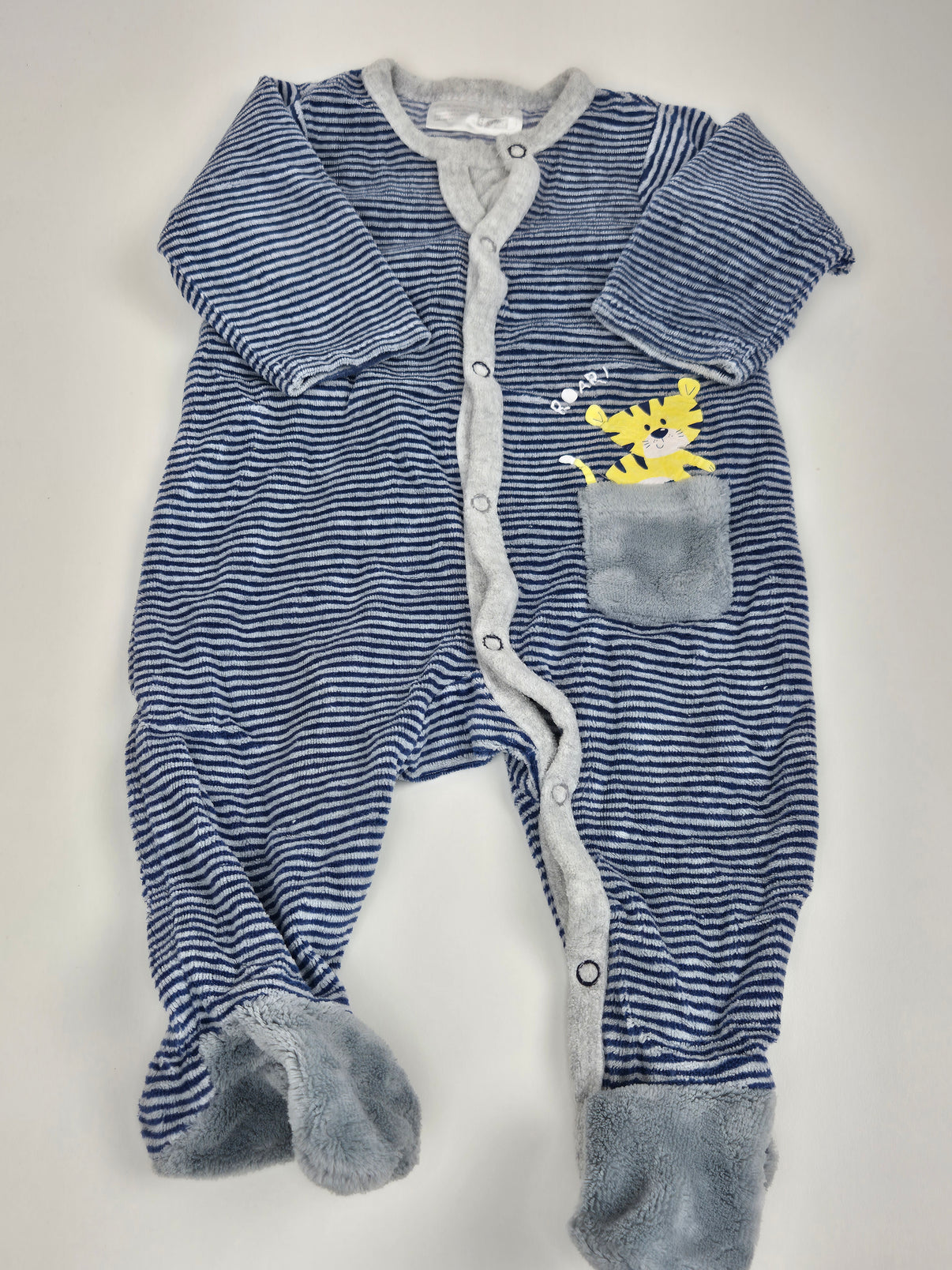 Měkoučké pruhované dupačky Ergee, velikost 62, ideální na chladnější období. Materiál je hebký a hřejivý, uvnitř příjemný na dotek. Zapínání na patenty po celé délce usnadňuje převlékání i přebalování. Na přední straně je roztomilý obrázek tygříka vykukujícího z plyšové kapsičky.