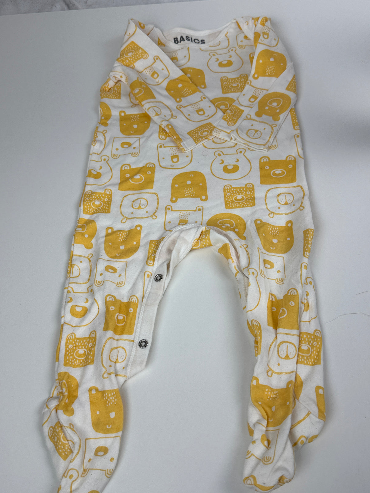 Dupačky značky F&F ve velikosti 74. Bílé provedení se žlutým potiskem roztomilých zvířecích hlaviček (medvídci a další motivy). Zapínání je na patentky po celé délce nohavic, což usnadňuje přebalování.