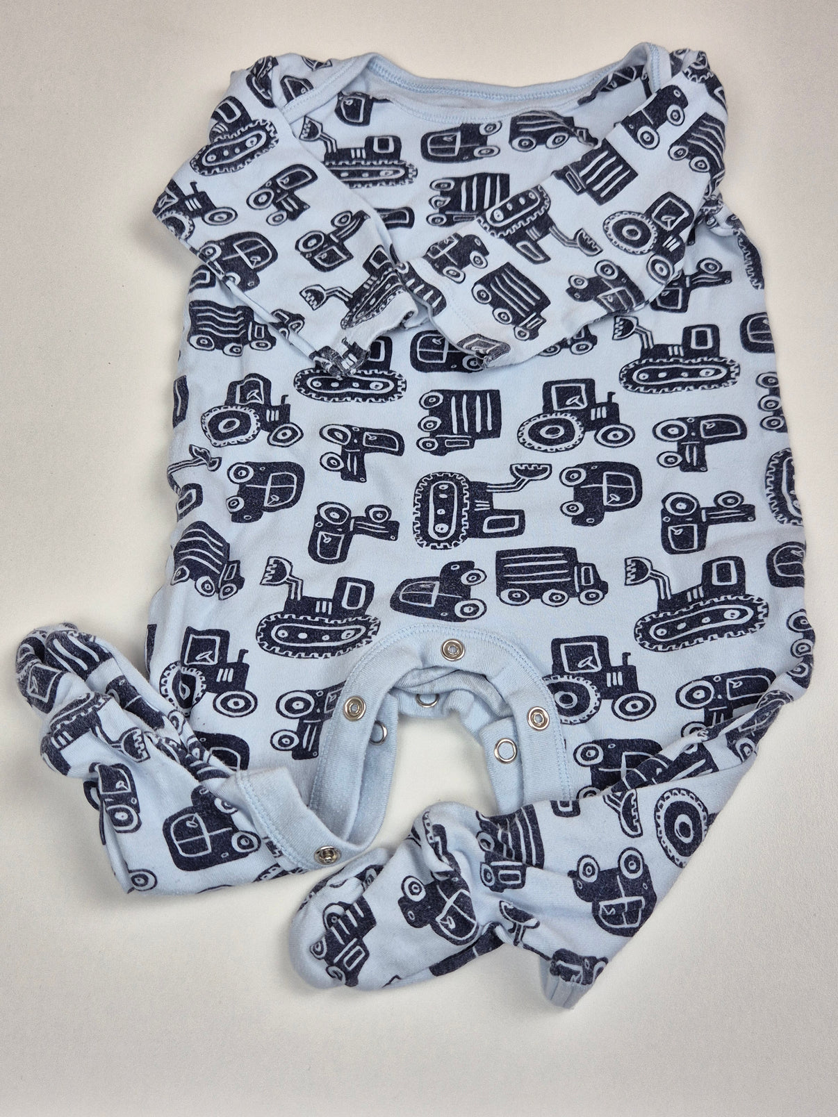 Měkoučké dupačky F&F v jemné světle modré barvě s výrazným tmavě modrým potiskem autíček, traktorů a bagrů – ideální kousek pro všechny malé milovníky strojů. Praktické zapínání na cvočky mezi nožičkami i na ramínku usnadní oblékání, integrované ťapky udrží nožičky pěkně v teple. Příjemný bavlněný materiál je skvělý na spaní i celodenní pohodlí doma.