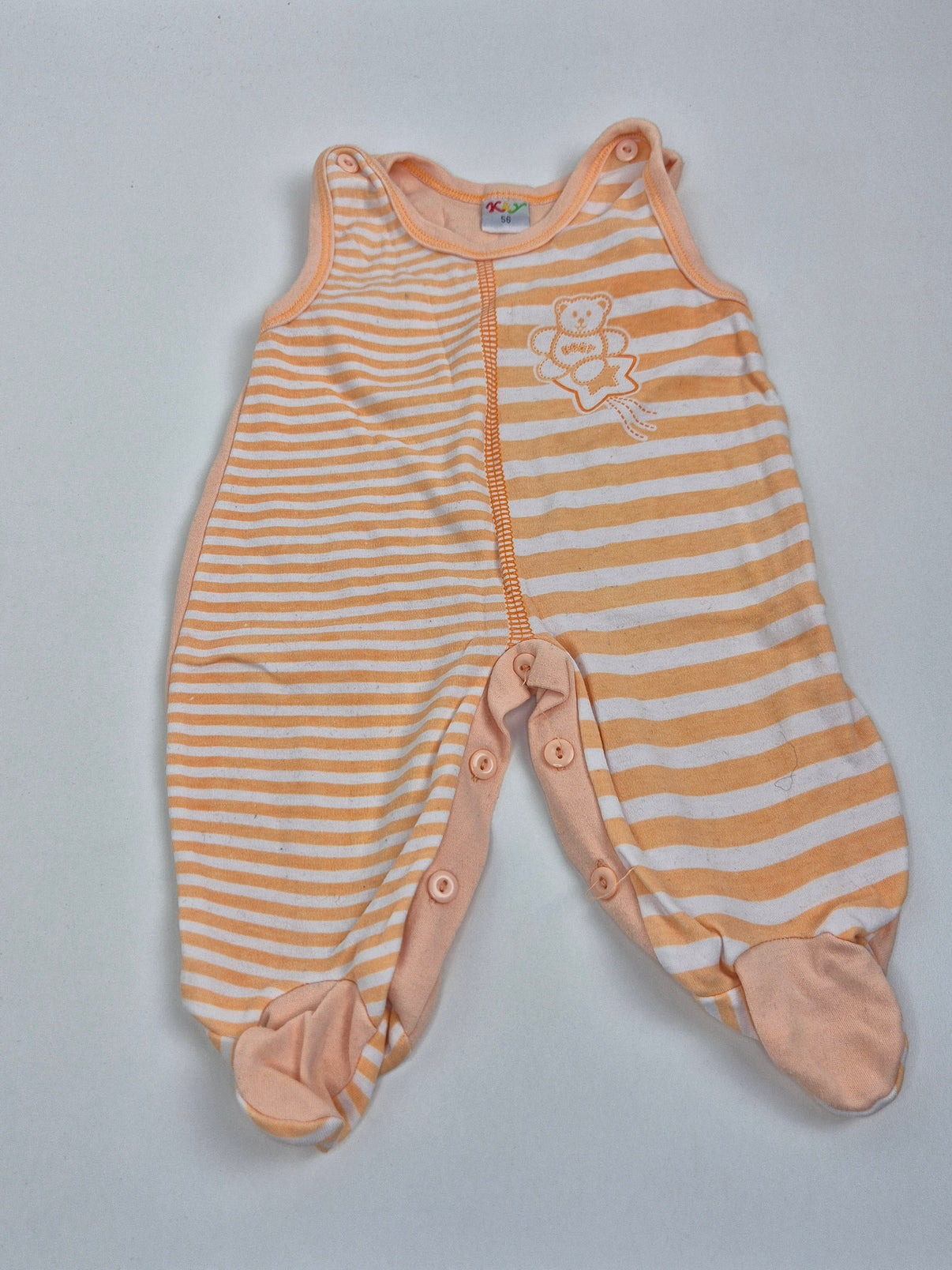 Jemné dupačky K&Y ve velikosti 56 v měkkém bavlněném provedení. Kombinace bílo-meruňkových proužků působí krásně něžně a na hrudi je doplňuje sladký medvídek. Ramínka na cvočky usnadní převlékání a zapínání mezi nožičkami pomáhá při rychlém přebalování. Integrované capáčky udrží malé nožky pěkně v teple. Ideální první kousek pro miminko – neutrální, pohodlný a roztomilý.