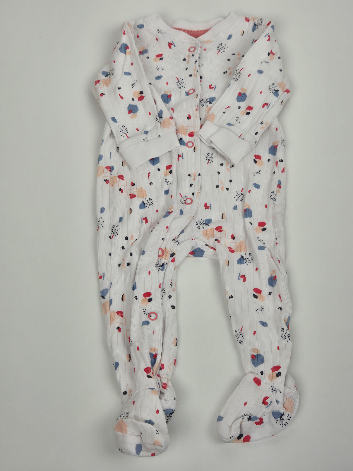 Pohodlné a hebké dupačky značky Kuniboo ve velikosti 68, ideální pro každodenní nošení i klidné spaní. Základ tvoří bílý podklad s jemným žebrováním, zdobený hravým celoplošným vzorem v odstínech modré, lososové, červené a černé. Zapínání na druky po celé délce usnadňuje převlékání a přebalování. Díky zakrytým chodidlům miminku krásně zahřejí nožičky.