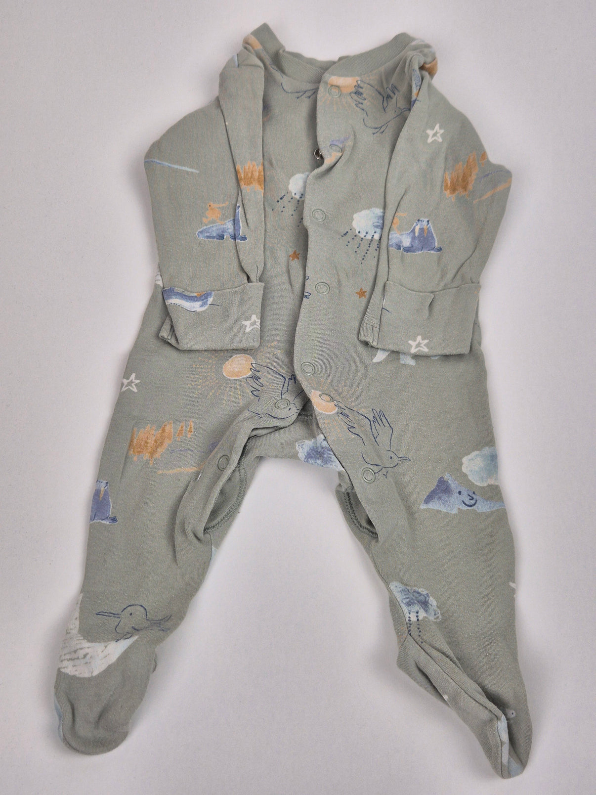 Pohodlné dupačky od Marks & Spencer ve velikosti 62 zaujmou jemným pastelově zeleným podkladem a roztomilým motivem zvířátek, hor a obláčků. Zapínání po celé délce usnadňuje oblékání i přebalování. Ideální volba na spaní nebo domácí lenošení.