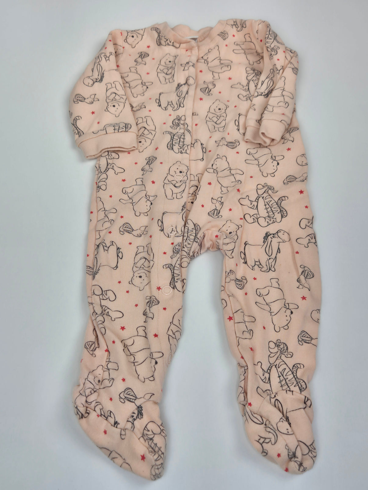 Roztomilé dupačky z Lidlu v jemném lososově růžovém odstínu, celé pokryté milým motivem Medvídka Pú a jeho kamarádů. Měkký bavlněný materiál je příjemný na nošení a ideální na spaní i celodenní pohodlí. Celopropínací zapínání na patentky výrazně usnadňuje oblékání a přebalování. Tento motiv potěší především malou holčičku, ale skvěle padne i každému malému milovníkovi Disney postaviček.