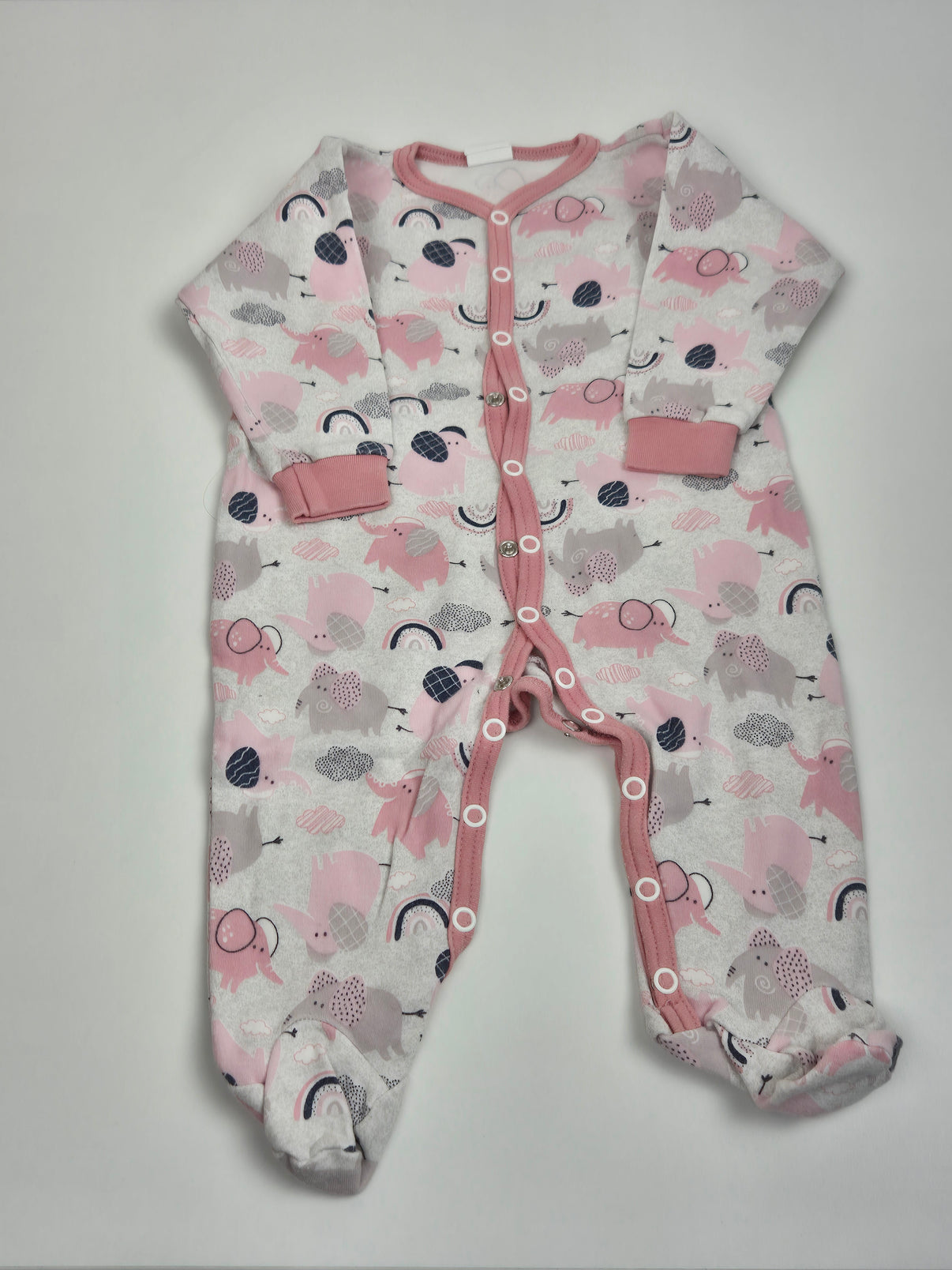 Roztomilé dupačky v jemném šedém melíru s celoplošným potiskem sloníků, duhových oblouků a obláčků v růžových a pastelových tónech. Kombinace světle růžového lemování a hravého vzoru působí něžně a veselě. Praktické zapínání na patentky po celé délce až k nožičkám výrazně usnadní přebalování. Měkký a příjemný materiál zajistí miminku pohodlí při spaní i během dne – ideální na doma, do kočárku i na návštěvy.