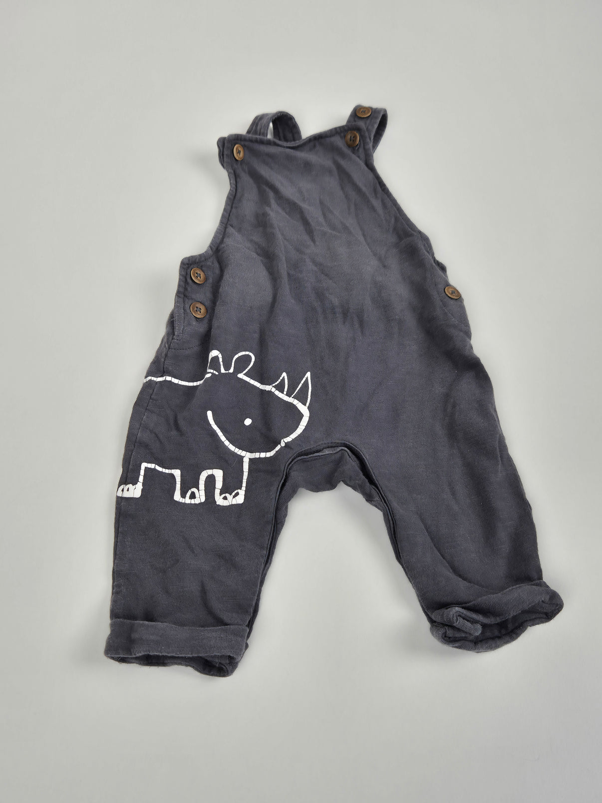 Tmavě šedý laclový overal značky F&F ve velikosti 62. Na přední straně zdobí velký bílý potisk nosorožce. Zapínání na dřevěné knoflíky po stranách i na ramínkách, spodní část s možností...