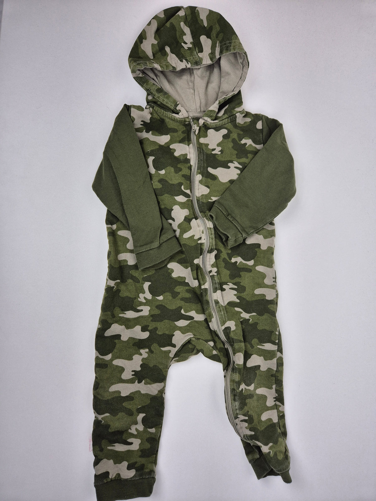 Stylový teplákový overal s kapucí od značky Sinsay ve velikosti 92 potěší všechny malé dobrodruhy. V maskáčovém vzoru v odstínech zelené a béžové působí cool a moderně. Zapínání na zip...
