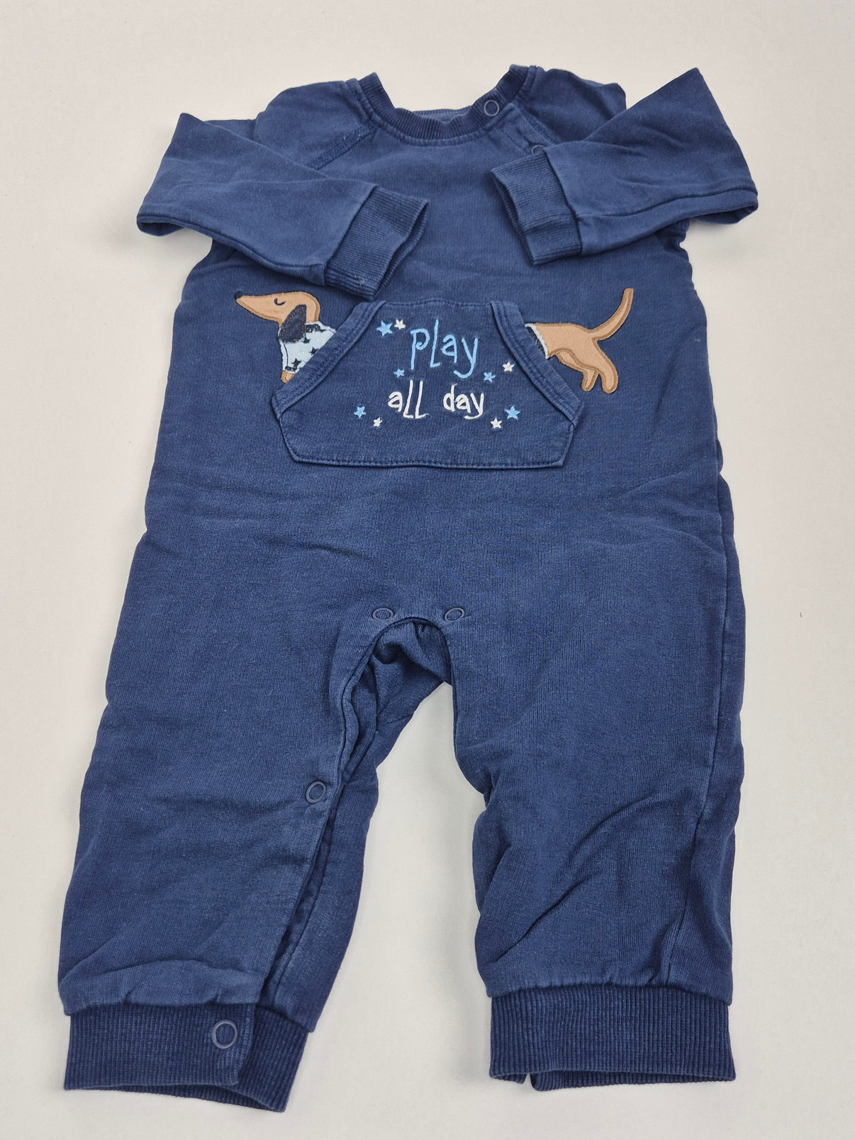 Mikinový overal v krásné temně modré barvě, ideální na každodenní hraní i lenošení. Příjemný měkký materiál zahřeje a díky praktickým patentkám v dolní části se snadno obléká. Na přední kapse zdobí roztomilý motiv pejska a výšivka “Play all day”, která dodává hravý detail.