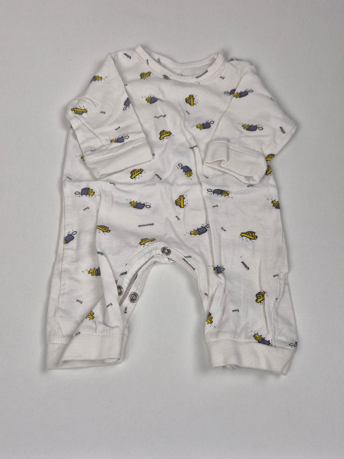 Bílý overal značky Sinsay ve velikosti 56. Celopotisk se žlutými bagříky a šedými autíčky působí hravě a veselě. Praktické zapínání na patentky po celé délce i mezi nožičkami usnadní převlékání a přebalování. Pohodlný kousek pro chlapečky na doma i na spaní. 🚜🚧✨