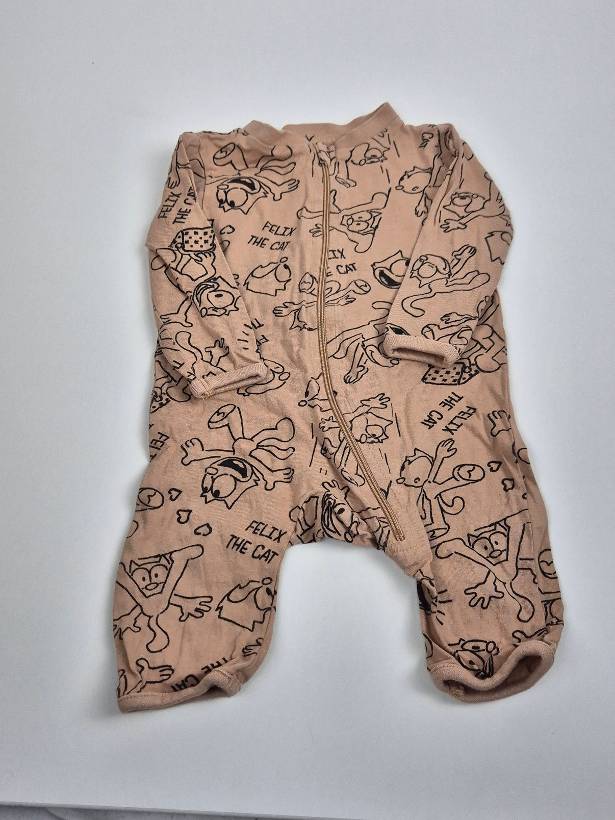 Béžový overal v jemném teplém odstínu karamelové béžové je zdobený hravým černým potiskem s motivem Felix the Cat, který dodává kousku veselý a nadčasový vzhled. Praktické zapínání na zip po celé délce usnadní převlékání a kryté lemy na rukávech i nohavicích pomáhají udržet teplo.