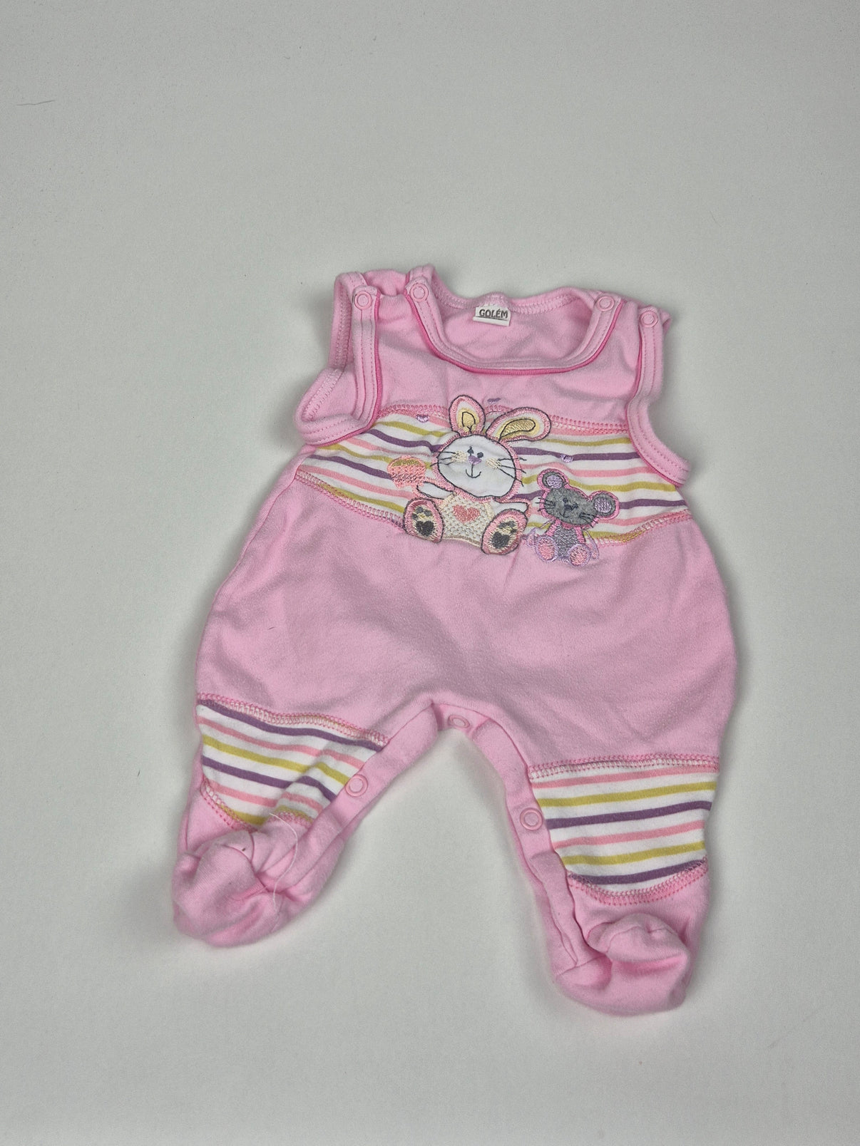 Jemné růžové dupačky značky Golém jsou jako stvořené pro první dny miminka. Přední stranu zdobí výšivky roztomilého zajíčka a myšky, doplněné veselými proužky v pastelových barvách. Dupačky jsou ušité z příjemného bavlněného materiálu, který je šetrný k citlivé pokožce. Praktické zapínání na ramínkách a mezi nožičkami usnadňuje oblékání i přebalování. Ideální kousek pro holčičky na spaní i pohodové chvíle doma.