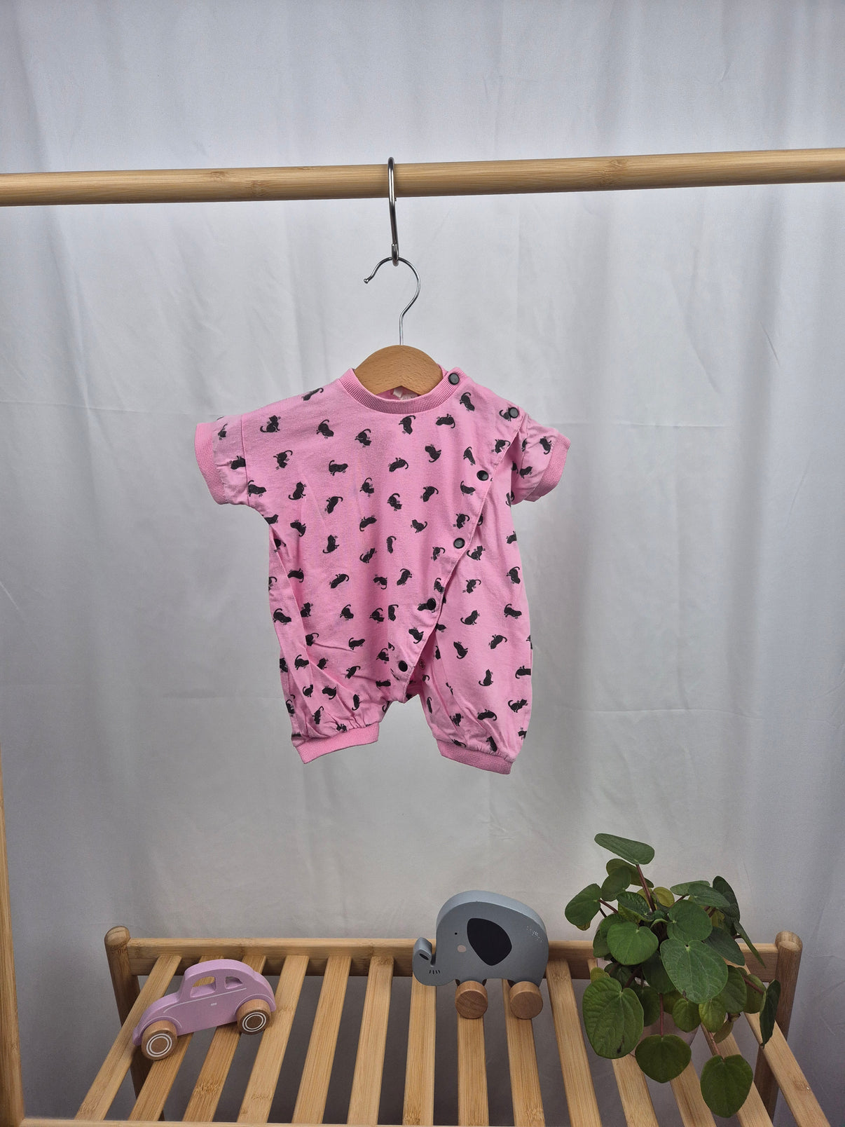 Roztomilý růžový overal s krátkým rukávem a motivem koček. Celoplošný potisk černých kočiček dodává outfitu hravý a stylový vzhled. Praktické zapínání na rameni a mezi nohama usnadňuje oblékání i přebalování....