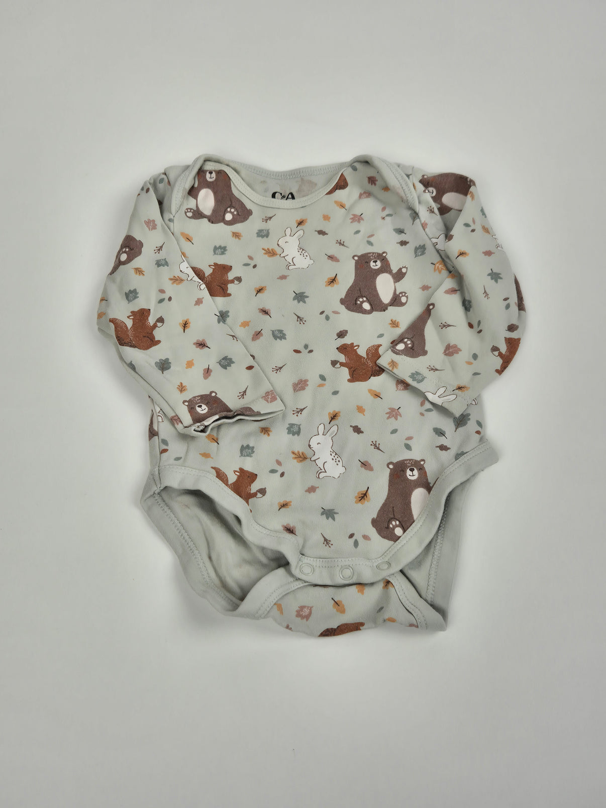 Pohodlné dětské body C&A s dlouhým rukávem a hravým lesním potiskem. Na světle šedém podkladu najdeš medvídky, zajíčky, veverky a podzimní lístky, které dodávají kousku veselý vzhled. Body je vyrobené z příjemného materiálu a díky praktickému zapínání mezi nožičkami usnadní každodenní přebalování. Velikost 74, vhodné pro holčičky i chlapečky.