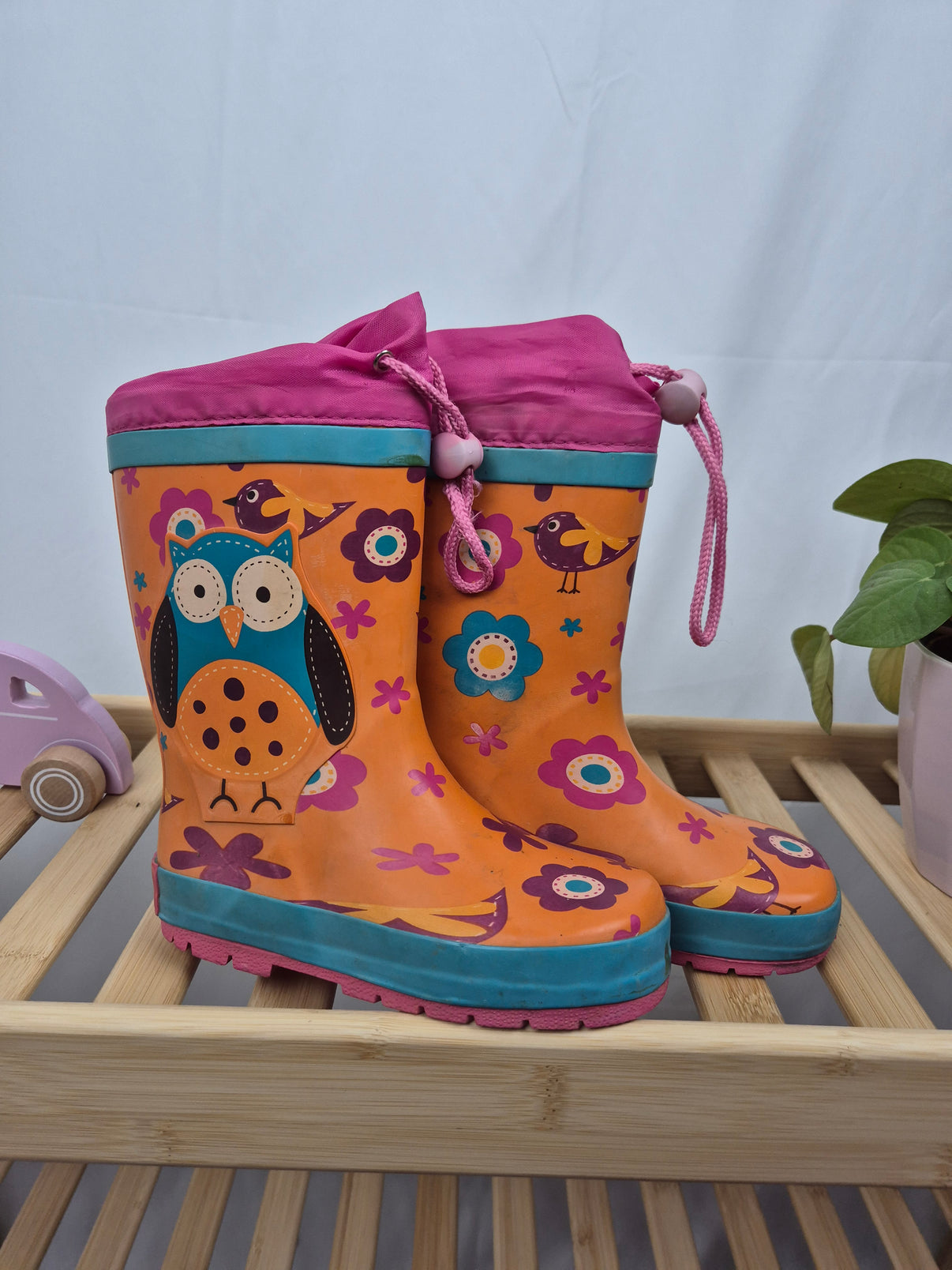 Veselé dětské holínky značky Pidilidi v zářivě oranžové barvě s motivem soviček, květin a ptáčků potěší každou malou milovnici barev a zvířátek. Praktické stažení v horní části pomáhá udržet nožky...