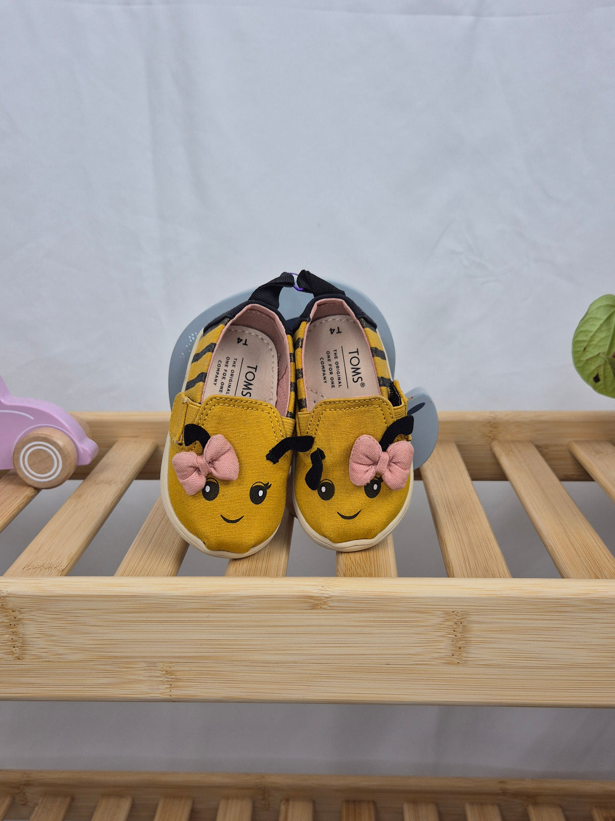 Žluté espadrilky s motivem včeličky TOMS ve velikosti 19,5 přinášejí kombinaci pohodlí, hravosti a stylu pro malé nožičky. Tyto roztomilé boty s veselým designem včelky, ozdobené růžovými mašličkami, okamžitě zaujmou každé dítě i rodiče.