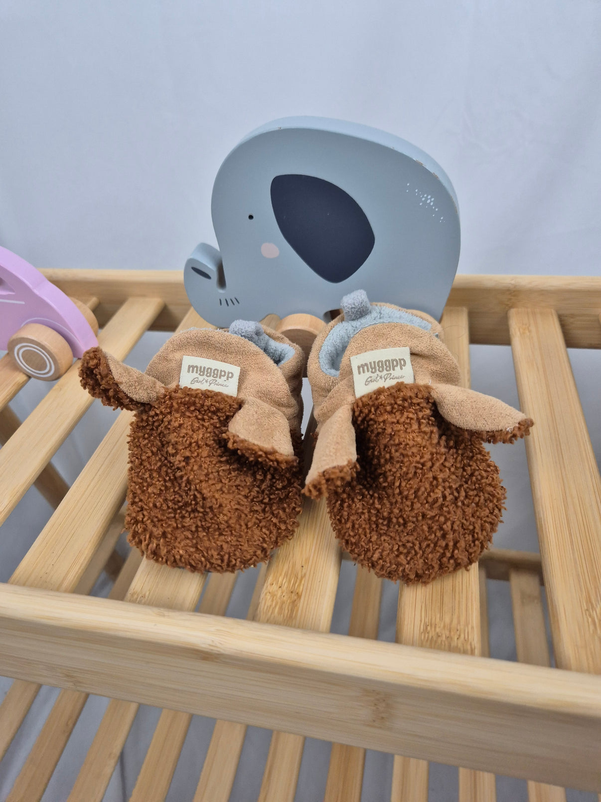 Měkoučké capáčky značky Myggpp ve velikosti 21 jsou jako stvořené pro zimní období nebo chladné dny doma. Vnější část z hnědého plyše a semišového materiálu doplňuje protiskluzová textilní podrážka s drobnými body pro bezpečný krok. Vnitřní fleecová podšívka příjemně zahřeje a pružný lem dobře drží na nožce. Hravý design se zvířecími oušky potěší kluky i holky. Skvělá volba pro pohodlné a stylové obutí nejmenších.