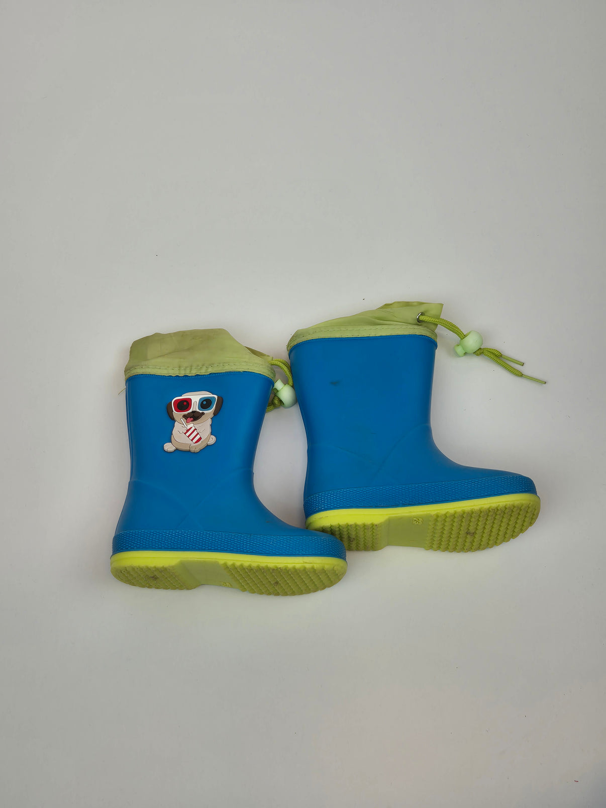 Veselé dětské holínky v sytě modré barvě s limetkovým stahovacím lemem, který chrání před vniknutím vody dovnitř. Na boku zdobí holínky roztomilý obrázek pejska s brýlemi. Díky praktickému tvaru a protiskluzové podrážce se skvěle hodí na deštivé dny a procházky v přírodě. Ideální obuv pro kluky, kteří rádi objevují svět i za špatného počasí. Velikost 23.