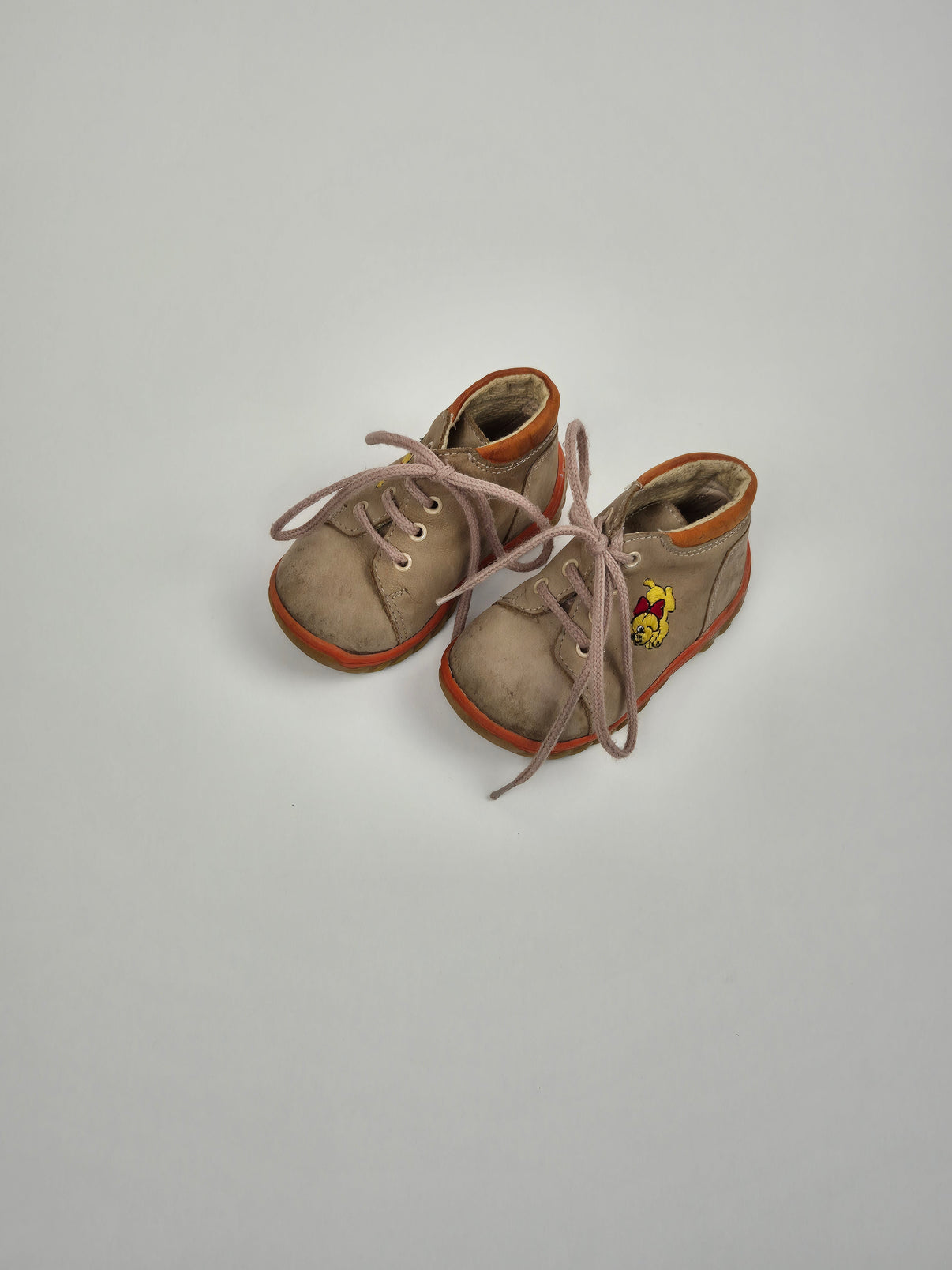 Kotníková obuv od značky TSM ve velikosti 19 jsou ideální pro první krůčky. Béžová barva s oranžovým lemem a veselým obrázkem na boční straně dodávají botkám hravý vzhled. Jsou celokožené s tkaničkami pro pevné uchycení a pružnou podrážkou, která podpoří přirozený pohyb dětské nožičky. Vhodné na každodenní nošení pro holky i kluky.