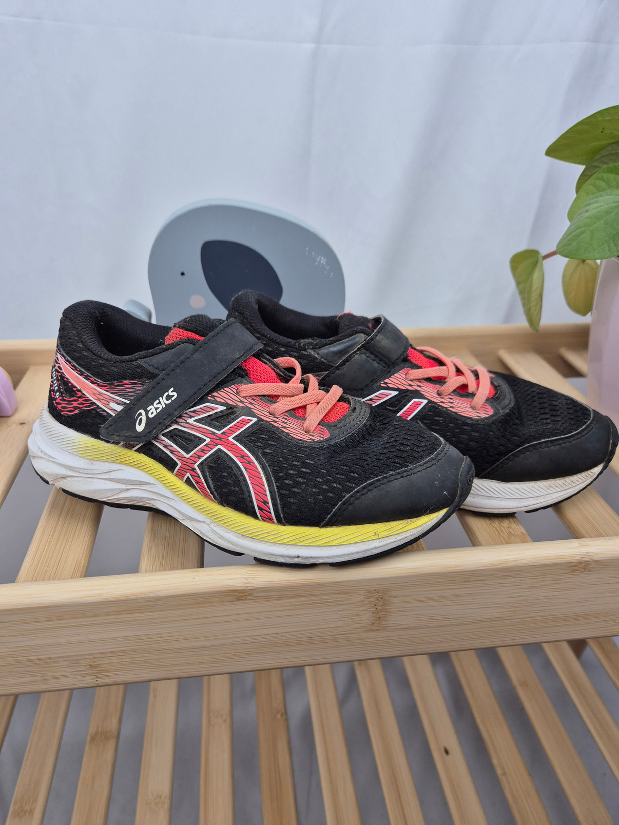 Sportovní tenisky značky Asics v černo-červeném provedení s výraznými žlutými detaily a ikonickým logem na boku. Svršek z prodyšné síťoviny zajišťuje pohodlí i při delším nošení, zatímco kombinace suchého zipu a gumiček usnadňuje obouvání. Skvělá volba pro aktivní děti – do školy, na sportovní kroužky nebo venkovní dovádění. Díky neutrálním barvám jsou vhodné jak pro kluky, tak pro holky.