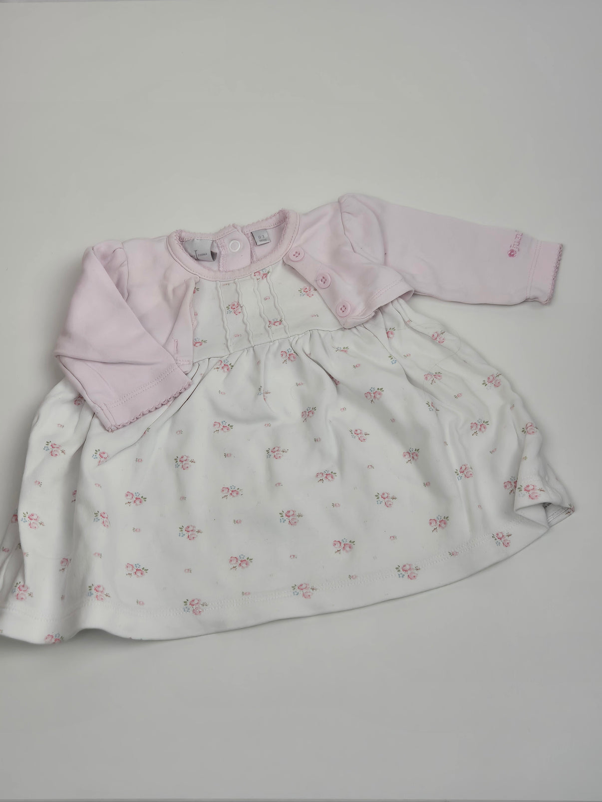 Něžné kojenecké šatičky v kombinaci krémově bílé a jemné pudrově růžové barvy působí velmi slavnostně a romanticky. Sukýnková část je zdobená drobným květinovým potiskem v pastelových tónech, zatímco vršek doplňuje růžové bolérko s jemnými knoflíčky. Decentní detaily a měkký materiál dělají z těchto šatů krásný kousek na návštěvy, rodinné oslavy i focení, zároveň jsou ale pohodlné i pro běžné nošení miminka.