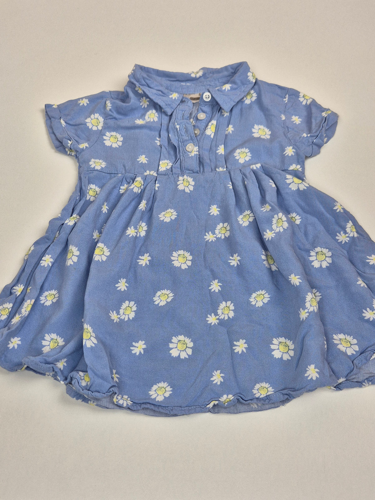 Lehoučké letní šaty v jemné modré barvě s celoplošným potiskem kopretin – krásný, svěží kousek pro malé parádnice. Příjemný splývavý materiál je ideální na teplejší dny, střih je vzdušný a pohodlný. Knoflíčky na hrudi usnadní oblékání a límeček dodává šatům roztomilý, lehce elegantní vzhled. Perfektní na běžné nošení, návštěvy i letní oslavy.