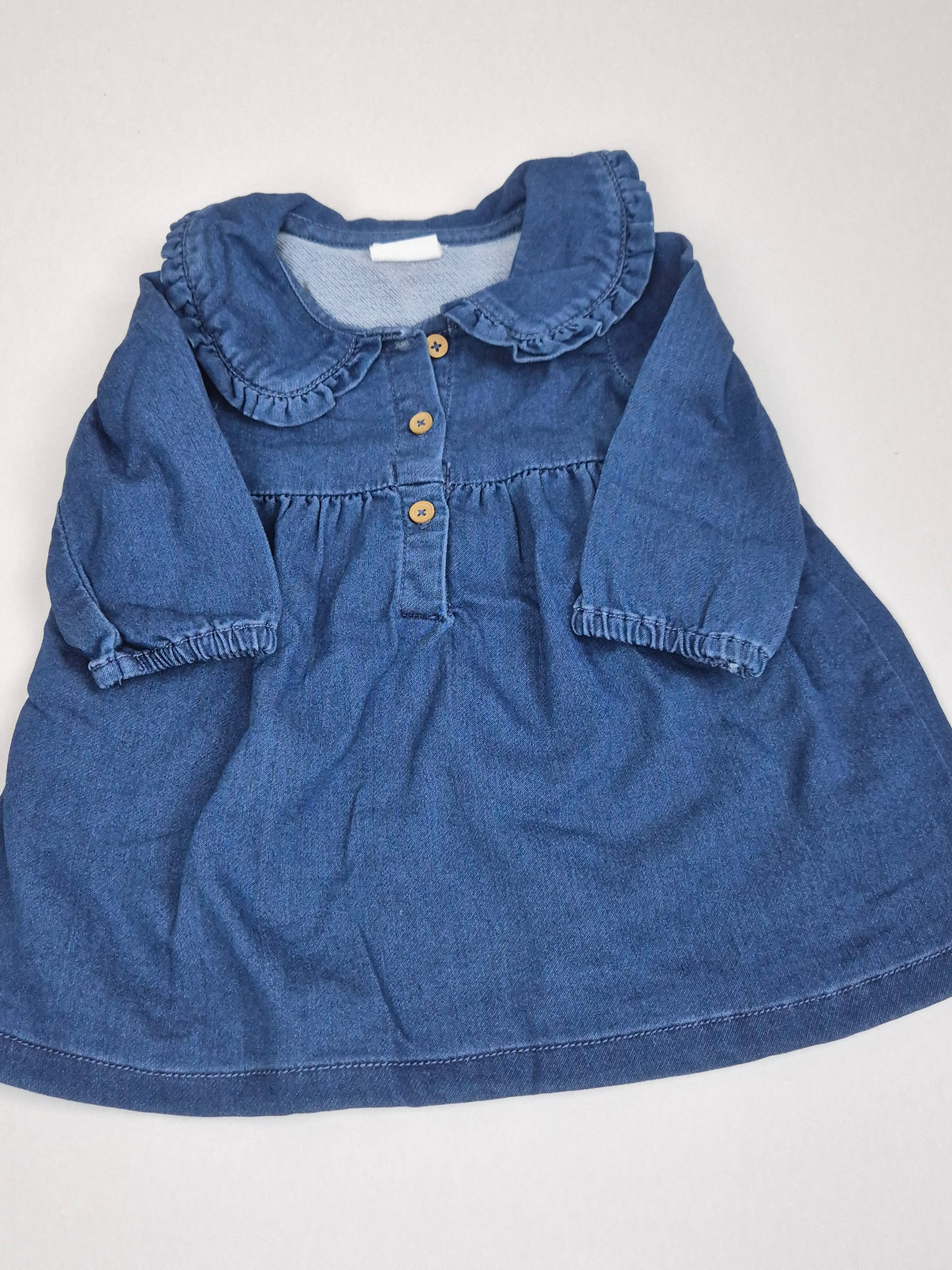 Roztomilé džínové šatičky od F&F v krásném hlubokém modrém odstínu, které se hodí jak na běžné nošení, tak i na malou příležitost. Mají jemně řasený límeček s volánkem, dřevěné knoflíčky na zapínání a příjemně měkký denim, který je pohodlný i pro nejmenší. V pase jsou lehce nařasené a rukávy zakončené pružnou gumičkou, takže hezky drží tvar. Skvělé k legínám i punčocháčkům.