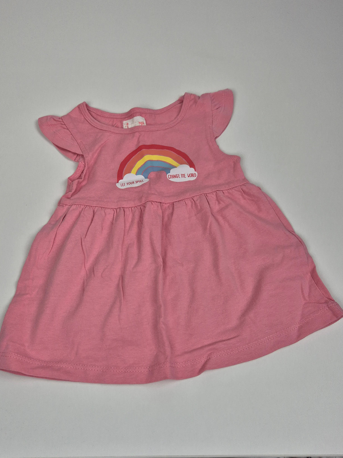 Růžové šatičky značky Impidimpi ve velikosti 62/68. Na hrudi je barevná duha s nápisy “Let your smile” a “Change the world”, která dodává kousku pozitivní energii. Krátký rukáv s jemným volánkem a lehký bavlněný materiál jsou ideální na jarní a letní dny. Sladký kousek pro malé holčičky na každý den i na výlety. 🌈💖
