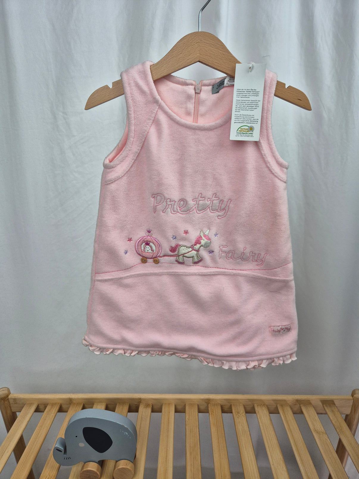 Roztomilé růžové šaty Jacky ve velikosti 80 jsou jemné, měkoučké a ideální pro malou parádnici. Jsou ušité z hebkého fleecového materiálu, takže krásně hřejí, a díky jednoduchému střihu bez rukávů se dají pohodlně vrstvit přes body nebo tričko. Přední stranu zdobí výšivka s kočárem a jednorožcem a nápis Pretty Fairy, spodní lem doplňují drobné volánky. Zapínání na zádech usnadňuje oblékání. Barvou i výšivkou jsou určené jednoznačně pro holčičku.