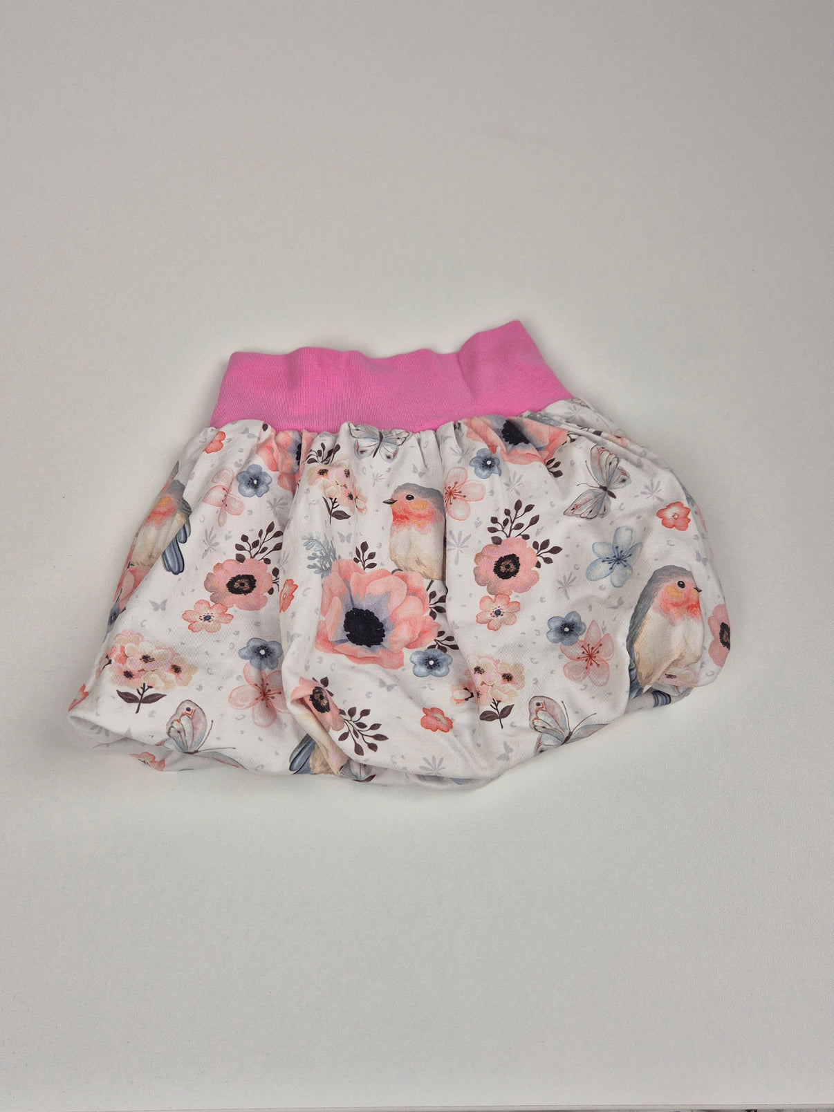 Krásná sukýnka z české malovýroby ve velikosti 92. Bílý podklad zdobí jemný květinový motiv s ptáčky a motýlky v pastelových tónech růžové, modré a šedé. V pase je růžový pružný...