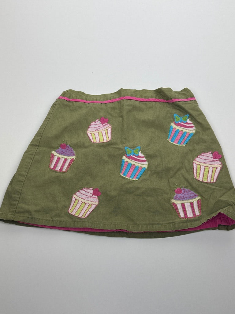 Stylová sukně v khaki zeleném odstínu zaujme hravými výšivkami barevných cupcakes, které dodávají kousku originální a veselý vzhled. Příjemný bavlněný materiál je pohodlný na nošení a ideální na běžné dny do školky, školy i na volný čas. Růžový lem v pase a spodní kontrastní vrstva hezky doladí celkový vzhled. Skvěle se kombinuje s tričkem i mikinou. Hodí se především pro holčičku.