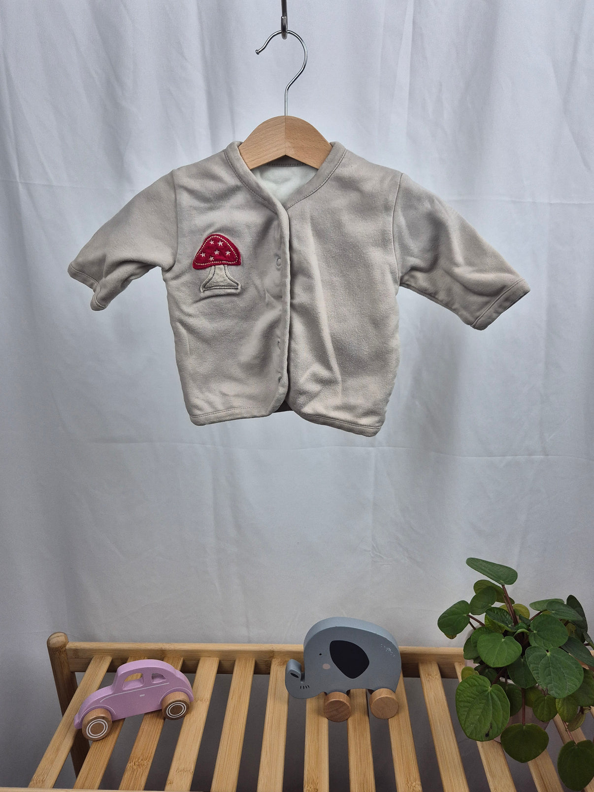Jemný dětský kabátek v neutrální béžové barvě s roztomilou výšivkou houbičky. Měkký a hřejivý materiál zajistí pohodlí i v chladnějších dnech. Praktické zapínání na patentky usnadňuje oblékání a svlékání. Skvělá volba pro miminka na doma i na procházky! 🍄💕