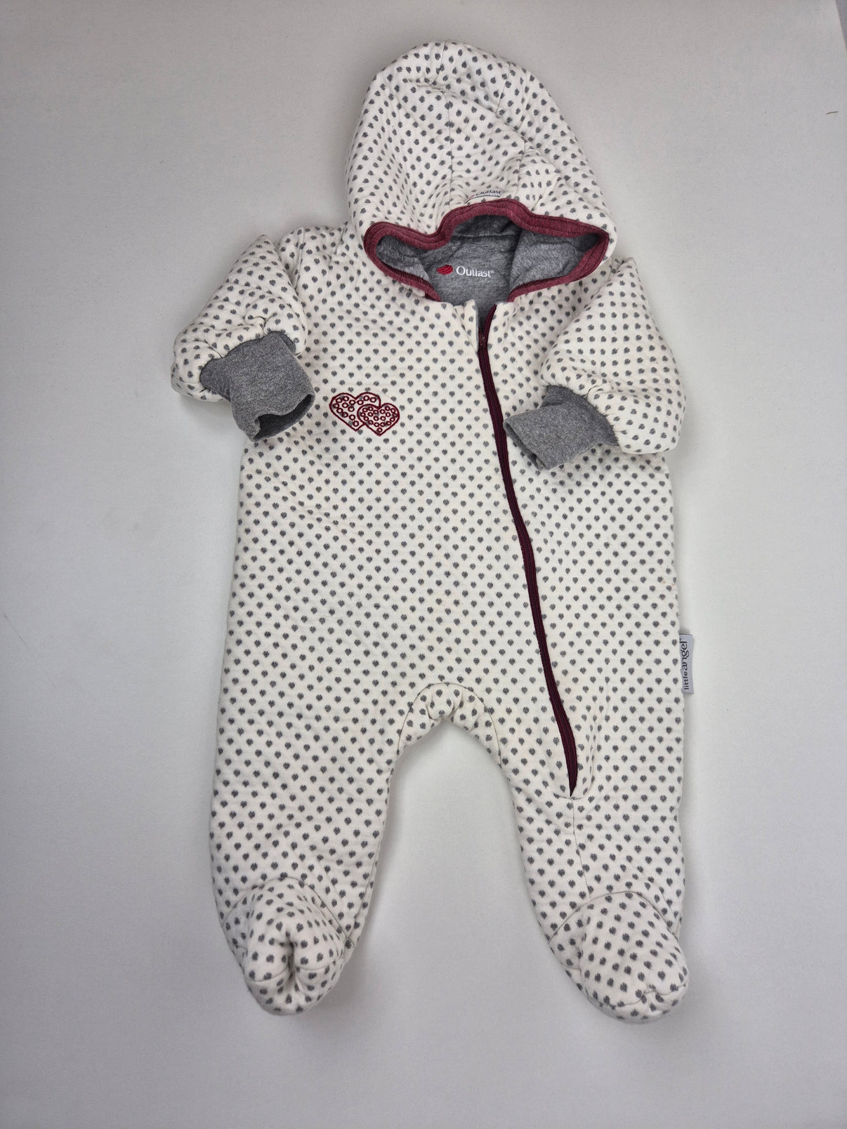 Hřejivá kojenecká kombinéza od značky Little Angel s technologií Outlast® je skvělou volbou pro chladnější dny. Krémový podklad s jemnými šedými puntíky působí něžně a univerzálně – hodí se pro holčičky i chlapečky. Uvnitř je měkký šedý úplet, který v kombinaci s kapucí a překrytím rukávků chrání před chladem a větrem.