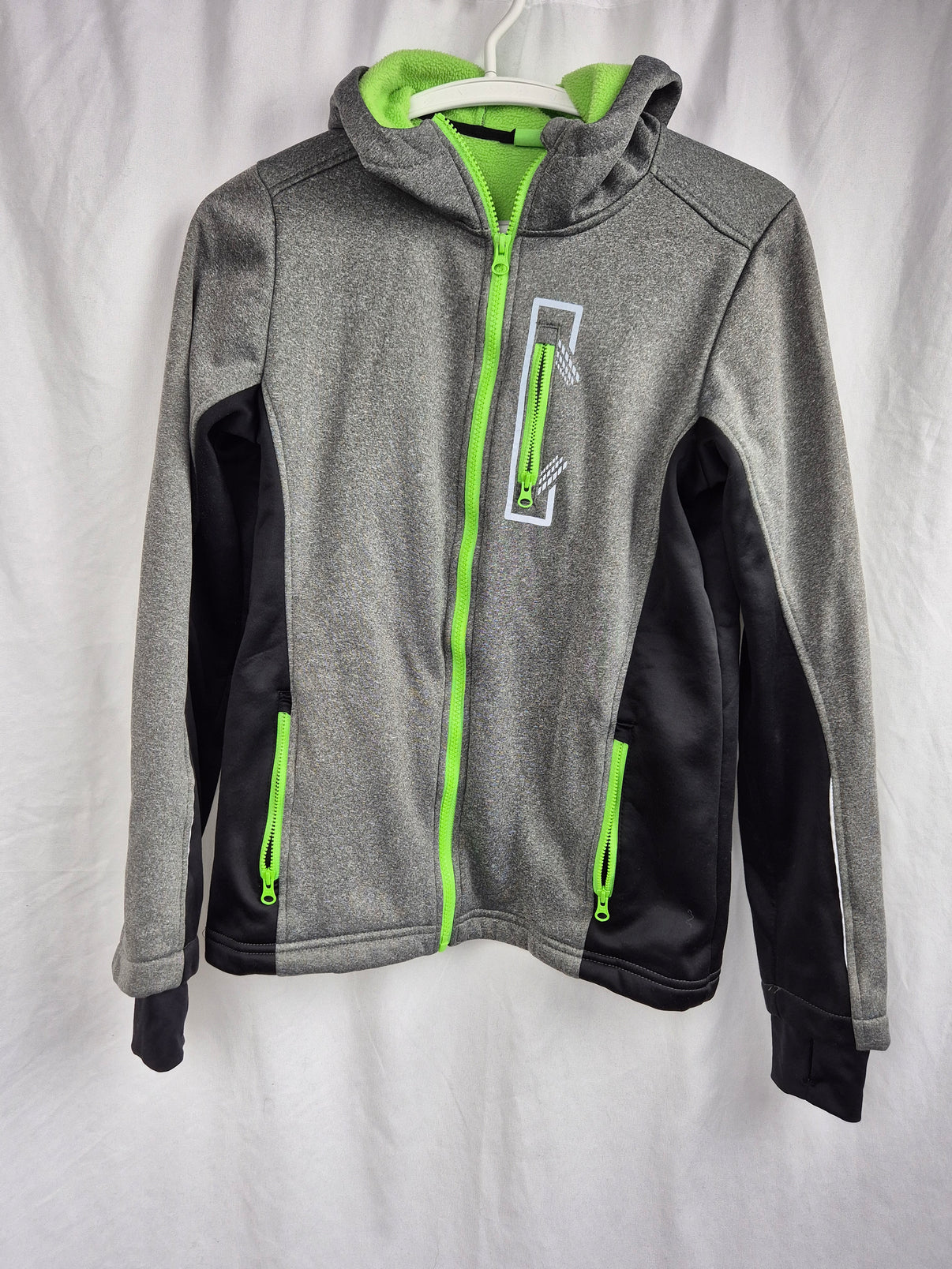 Sportovní softshellová bunda Crivit v odstínech šedé a černé s výraznými neonově zelenými zipy a vnitřním fleecem. Ideální na jaro, podzim i větrnější dny – softshell dobře odolá chladu, větru i drobnému dešti. Nechybí kapuce, praktické kapsy na zip a reflexní prvky na zádech pro lepší viditelnost. Střih je pohodlný a skvěle sedí aktivním klukům i holkám, kteří tráví čas venku.