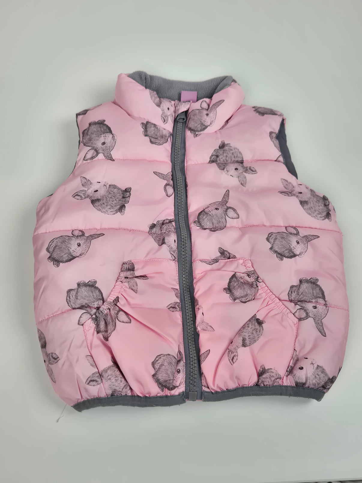 Růžová prošívaná vesta Dopodopo ve velikosti 86 s roztomilým celoplošným potiskem králíčků. Zapínání na zip a praktické kapsy na přední straně. Uvnitř hřejivá podšívka z fleecu, takže je ideální na přechodné období – na mikinu či svetr. Skvělý kousek pro malé holčičky.