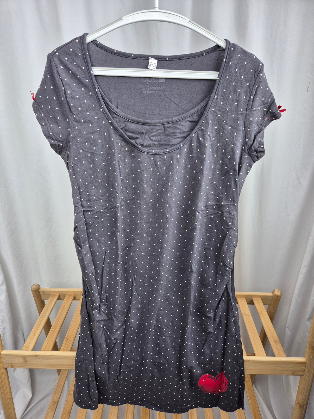 Pohodlná těhotenská a kojicí noční košile Bonprix v elegantní šedé barvě s jemným bílým puntíkovým vzorem. Díky měkkému, splývavému materiálu je košile ideální na celé období těhotenství i po porodu. Praktický dvojitý přední díl umožňuje snadné a diskrétní kojení. Krátké rukávy zdobí malé červené mašličky, které dodávají košilce jemný a ženský detail. V dolní části najdeš i decentní srdíčkovou aplikaci. Perfektní volba pro každodenní pohodlí doma i do porodnice.