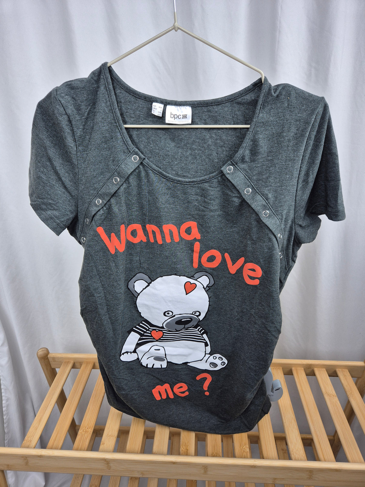 Pohodlná těhotenská a kojící noční košile Bonprix v tmavě šedé barvě, která kombinuje hravost a praktičnost. Přední stranu zdobí velký motiv medvídka s výraznými červenými detaily a nápisem Wanna love me?, díky kterému košile působí mladistvě a roztomile. Podél výstřihu jsou patentky, které umožňují snadné a diskrétní kojení – ideální na období po porodu i do porodnice.