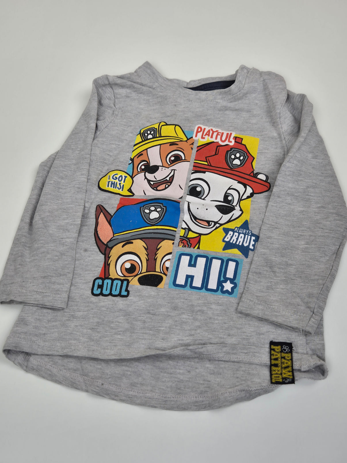 Pohodlné dětské tričko s dlouhým rukávem v světle šedé barvě, zdobené výrazným barevným potiskem oblíbených hrdinů z Tlapkové Patroly. Příjemný bavlněný materiál je ideální na každý den – do školky, na hřiště i na doma. Skvělé především pro kluky, kteří milují akční partu Paw Patrol.