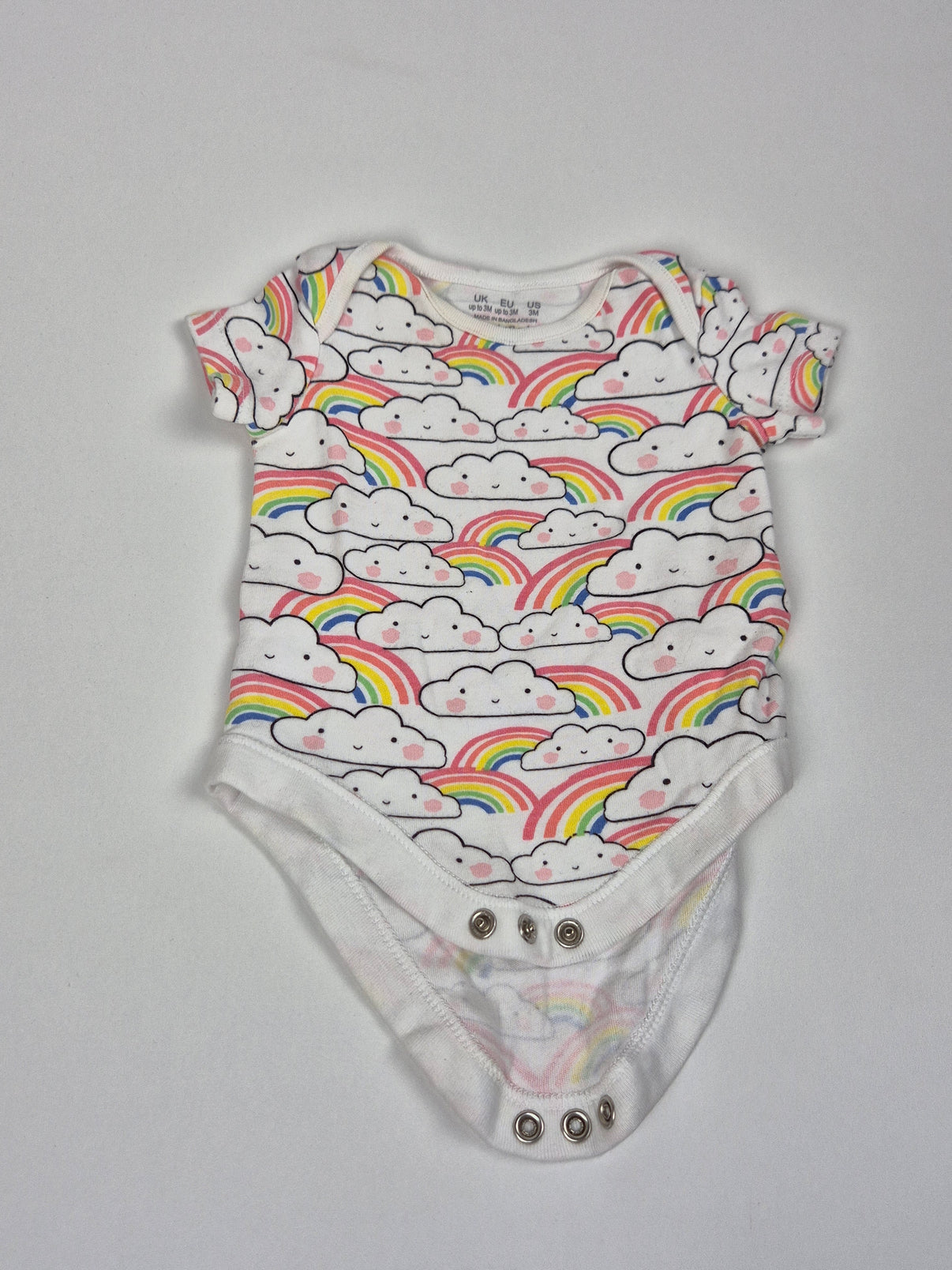 Veselé body značky F&F ve velikosti 62, s krátkým rukávem. Základ tvoří bílý podklad s hravým celoplošným potiskem usměvavých mráčků a duhy. Praktické zapínání na cvočky mezi nožičkami usnadňuje přebalování.