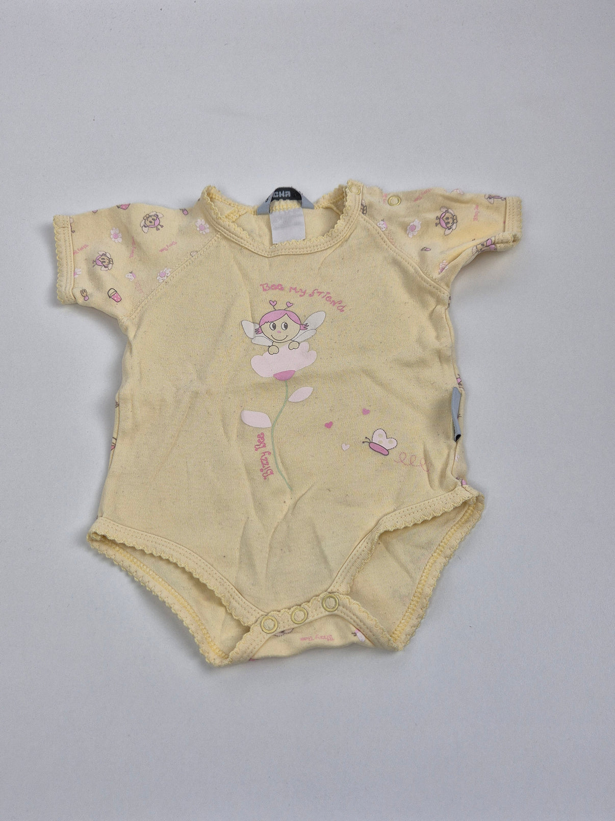 Jemné žluté body Jacky s krátkým rukávem a roztomilým potiskem včelky „Bee my friend“. Má drobné krajkové lemování kolem krku i nohaviček a praktické cvočky mezi nohami pro snadné přebalování. Pohodlný materiál je ideální na každodenní nošení – skvělý kousek pro holčičku.