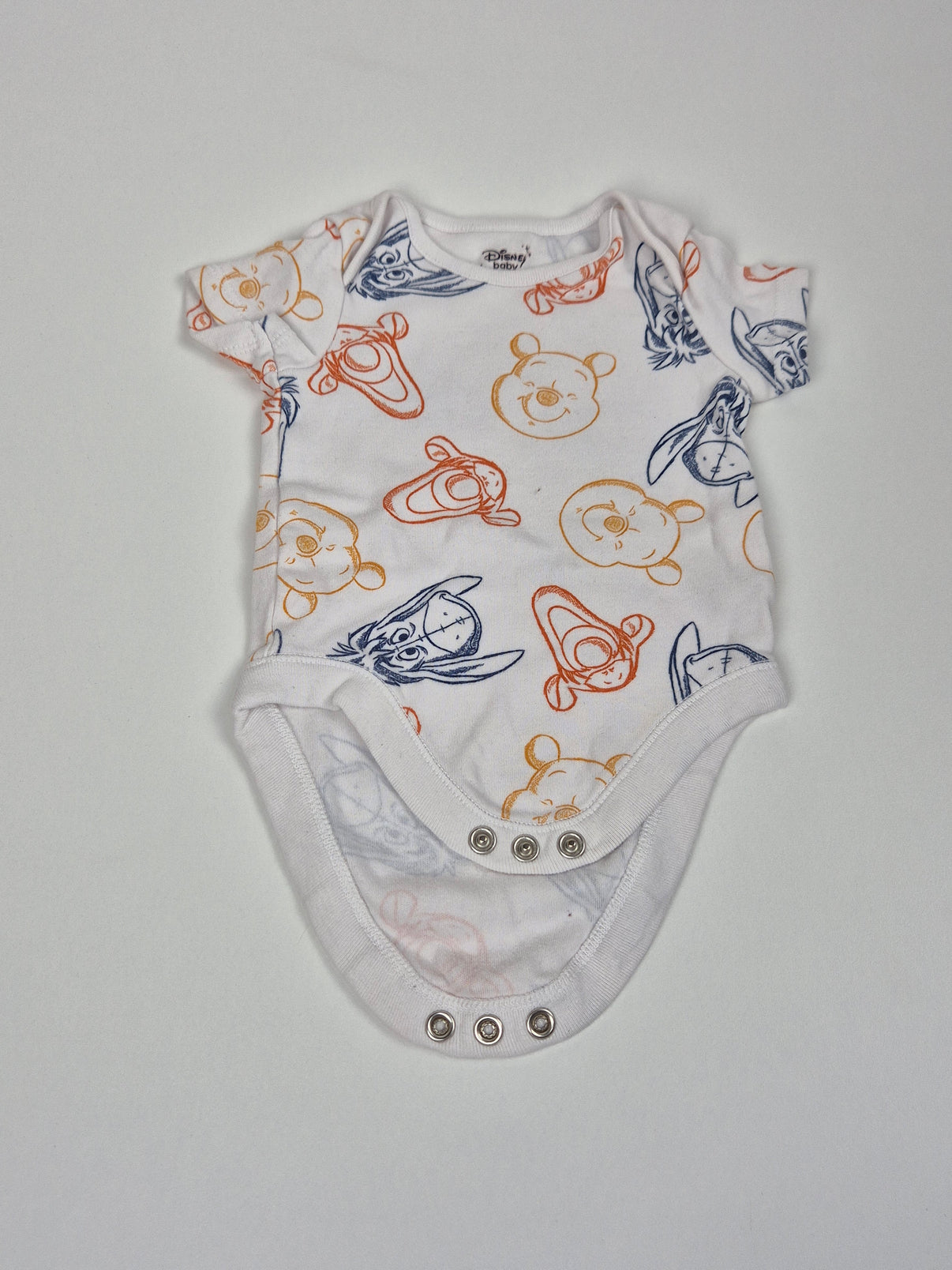 Bílé body F&F ve velikosti 62 s krátkým rukávem a potiskem oblíbených postaviček z pohádky Medvídek Pú – Pú, Tygr, Prasátko a Ijáček. Díky zapínání na patentky v rozkroku se snadno obléká a je pohodlným kouskem na každodenní nošení pro miminko.