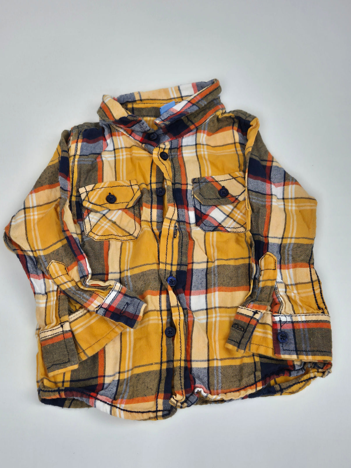 Žlutá, tmavě modrá a červená kostkovaná flanelová košile Dopodopo ve velikosti 80 – příjemně měkká, ideální na běžné nošení do školky, ven i na podzimní či zimní vrstvení. Má dvě praktické přední kapsičky a klasické zapínání na knoflíky.
